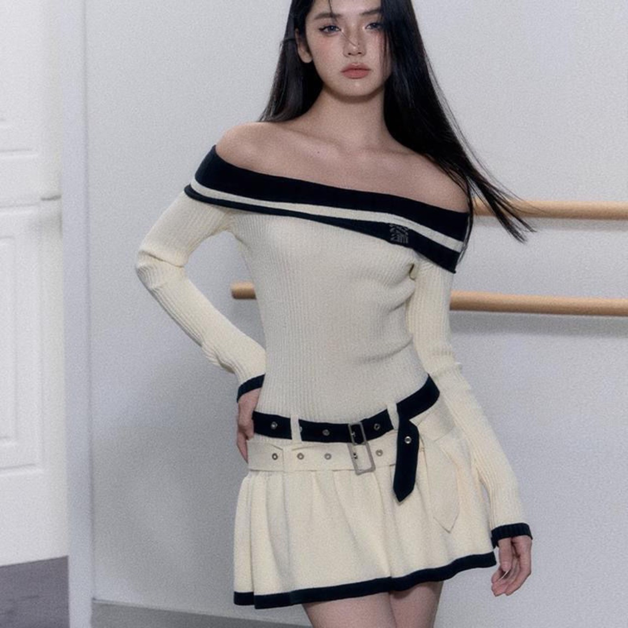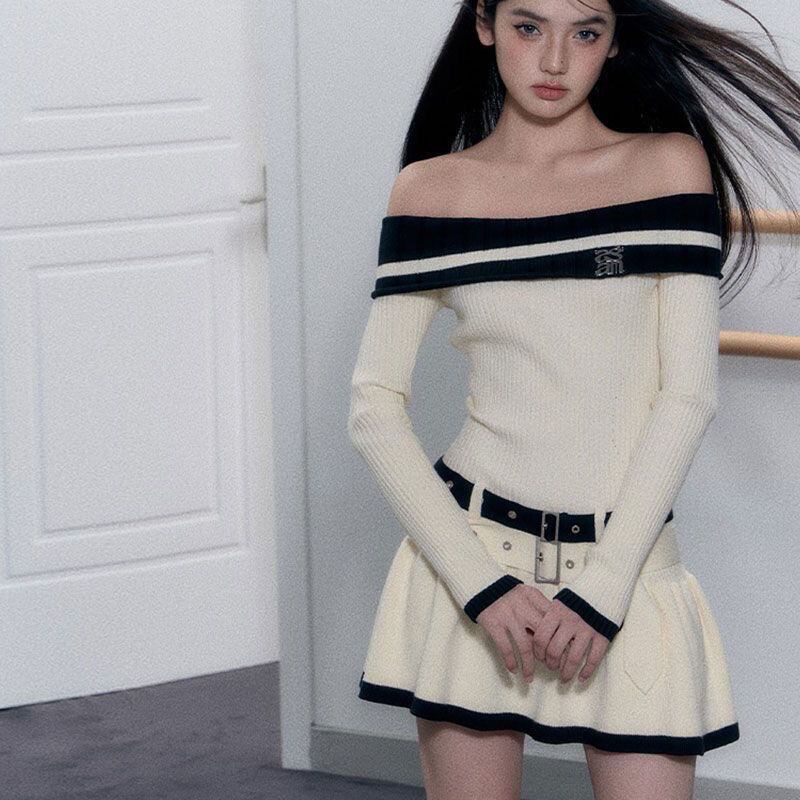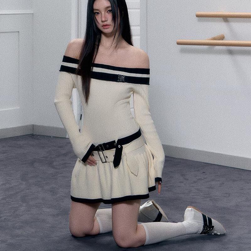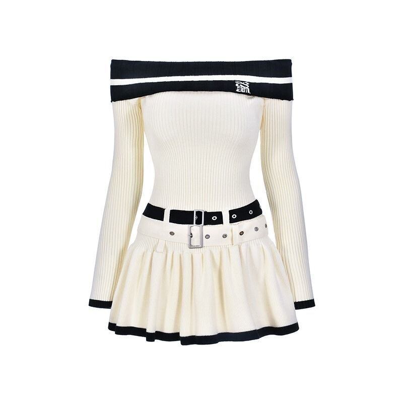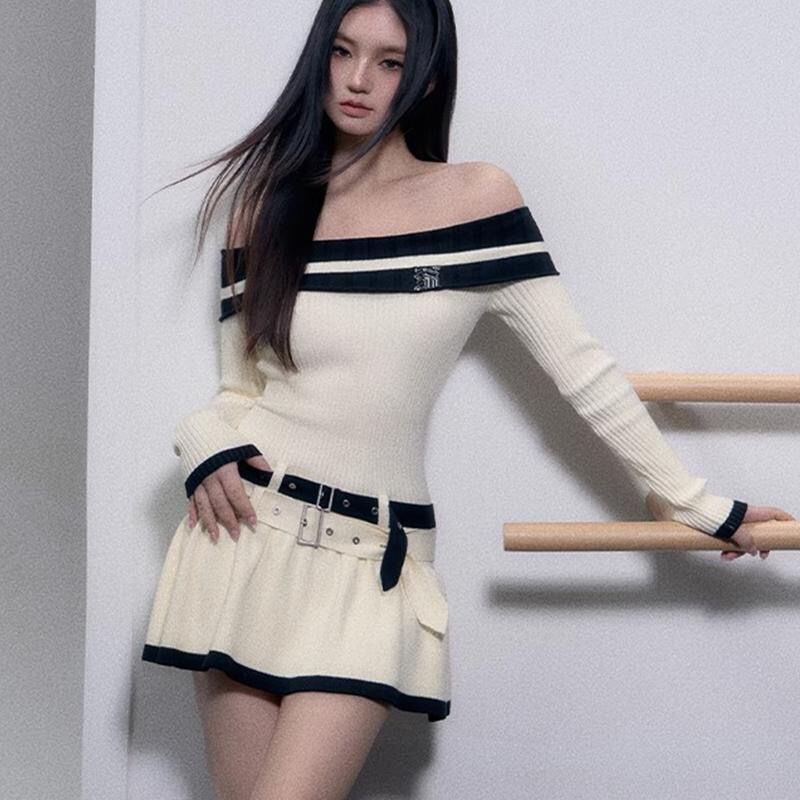 ホットガール純粋セクシーグレードカラーブロックドレス春/夏オフショルダーダブルベルトニットドレス服 スプリング 春物 サマー 夏物 ハーネス ピュア