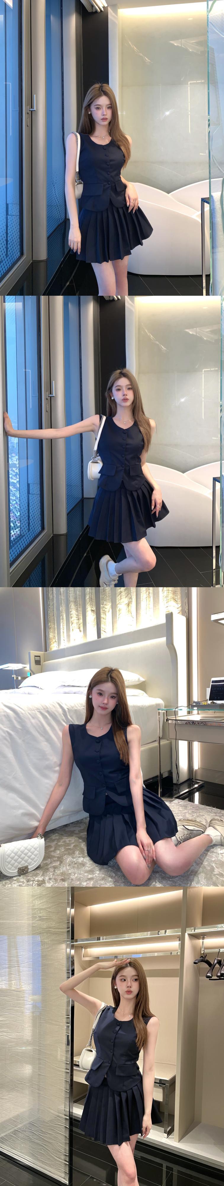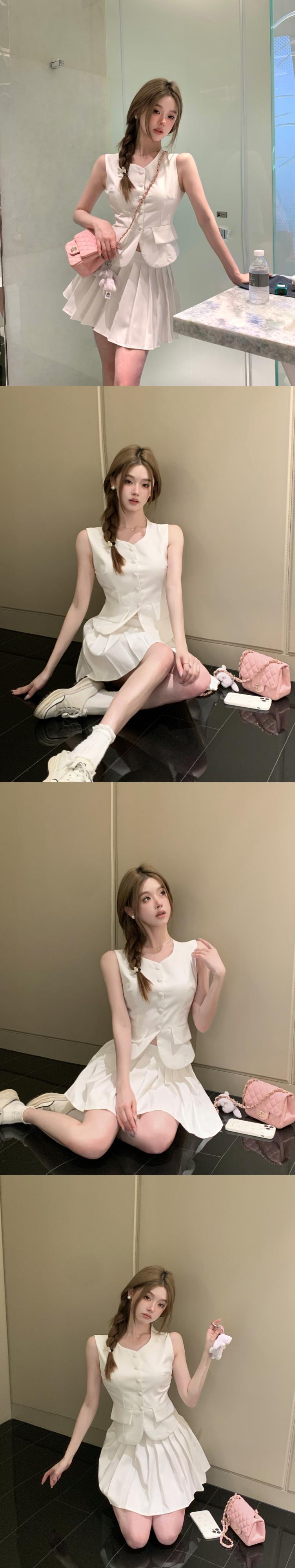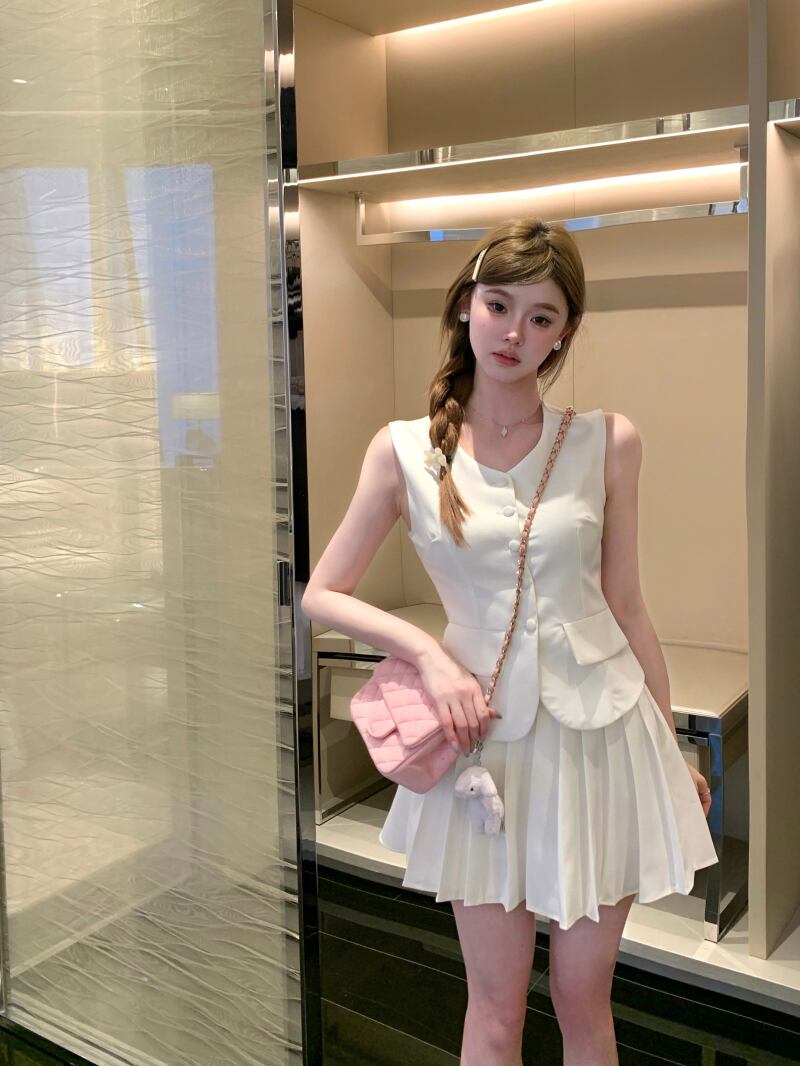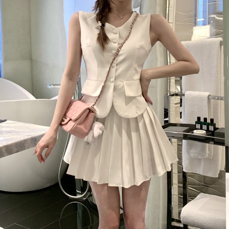 純粋セクシー白スーツ夏ノースリーブベストトップ A ラインプリーツショートスカート 2 点セット服 ホワイト サマー 夏物 Aライン