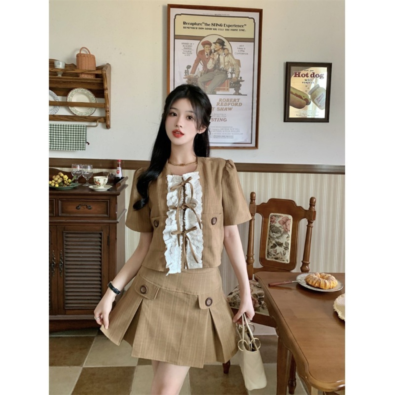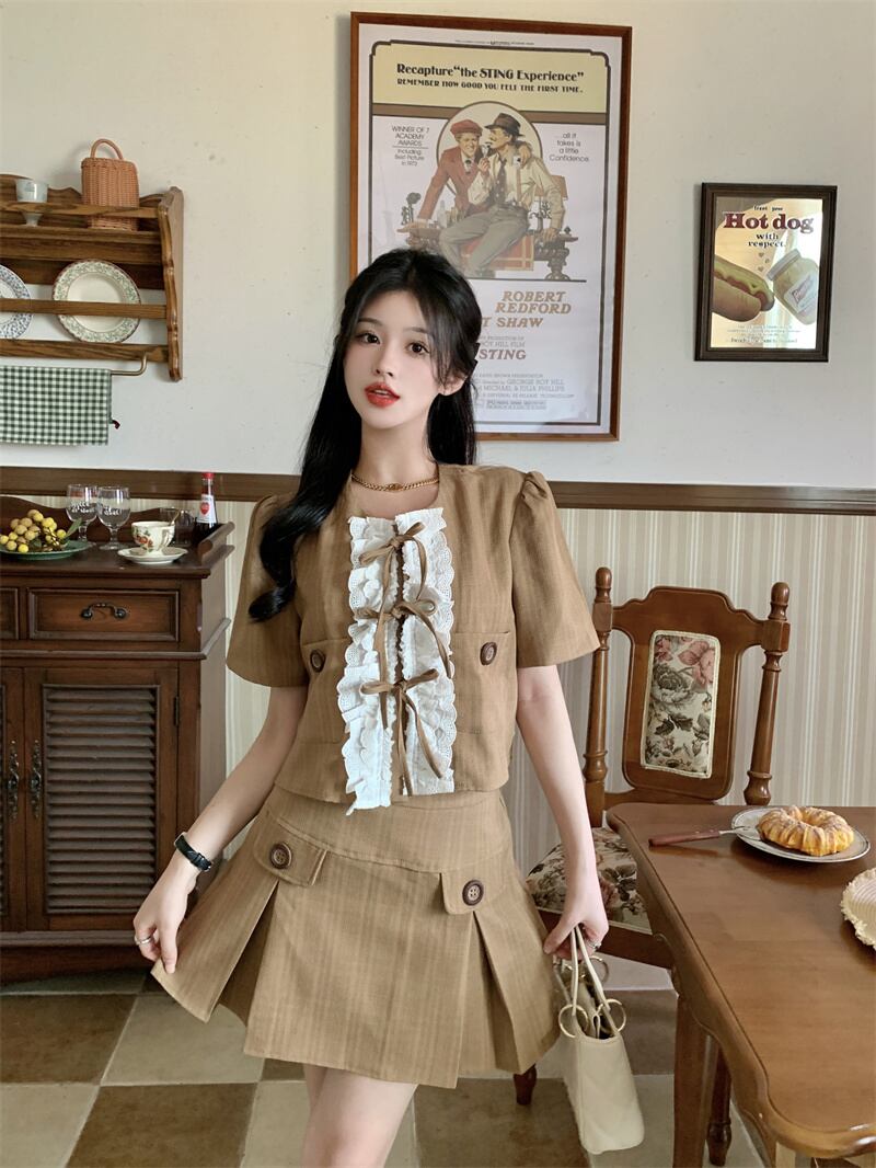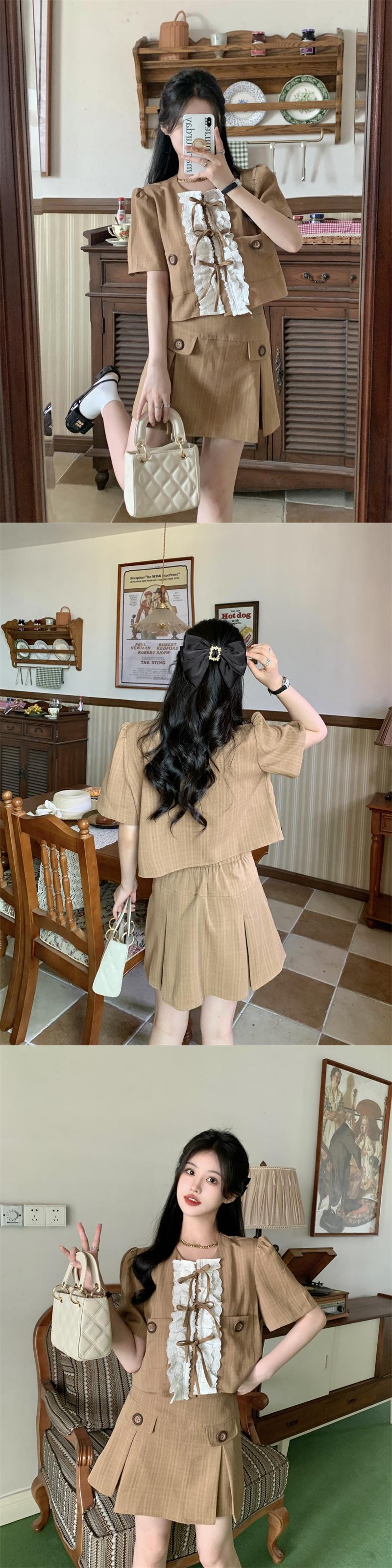 甘いホットガールスーツ夏ルーズラウンドネックボウシャツウエスト A ラインスカート 2 点セット服 リボン 大人ガーリー スウィート キュート カジュアル サマー 夏物 Oネック Aライン