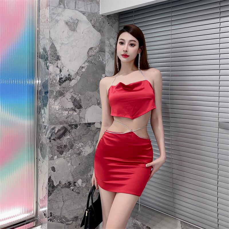 ホットガールスーツ夏ネックホルター背中開いたスリムフィットタンクトップウエストセクシーラップヒップミニスカート 2 点セット サマー 夏物