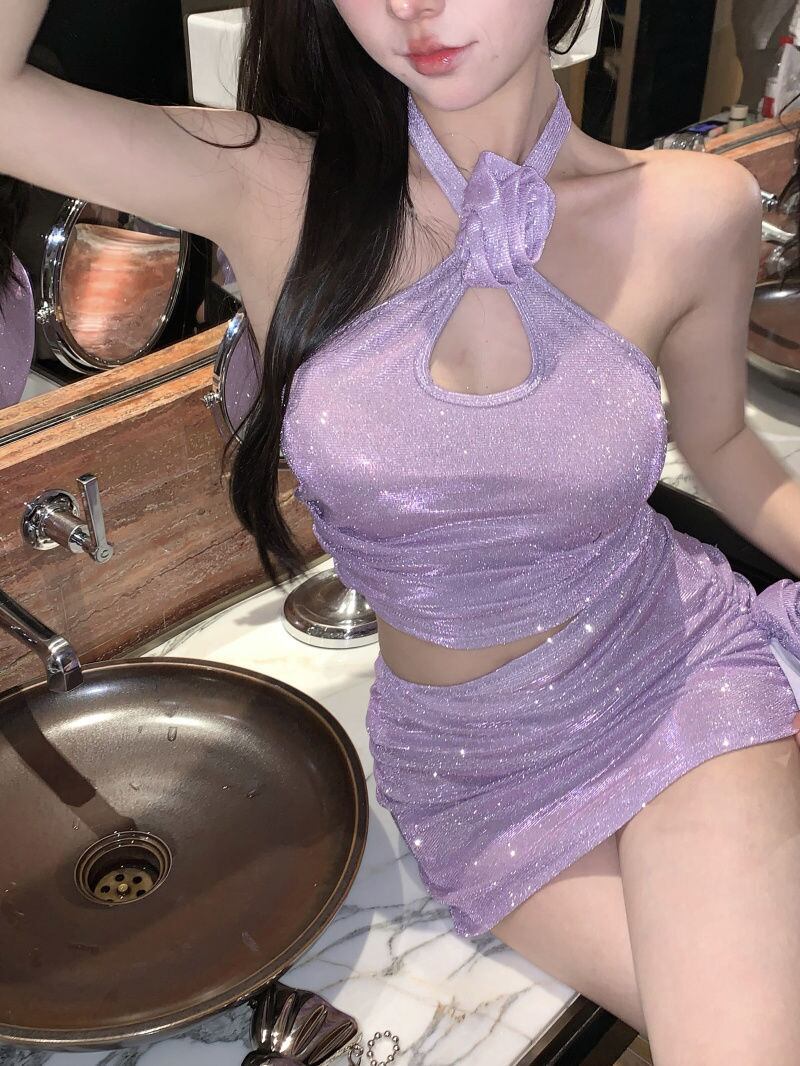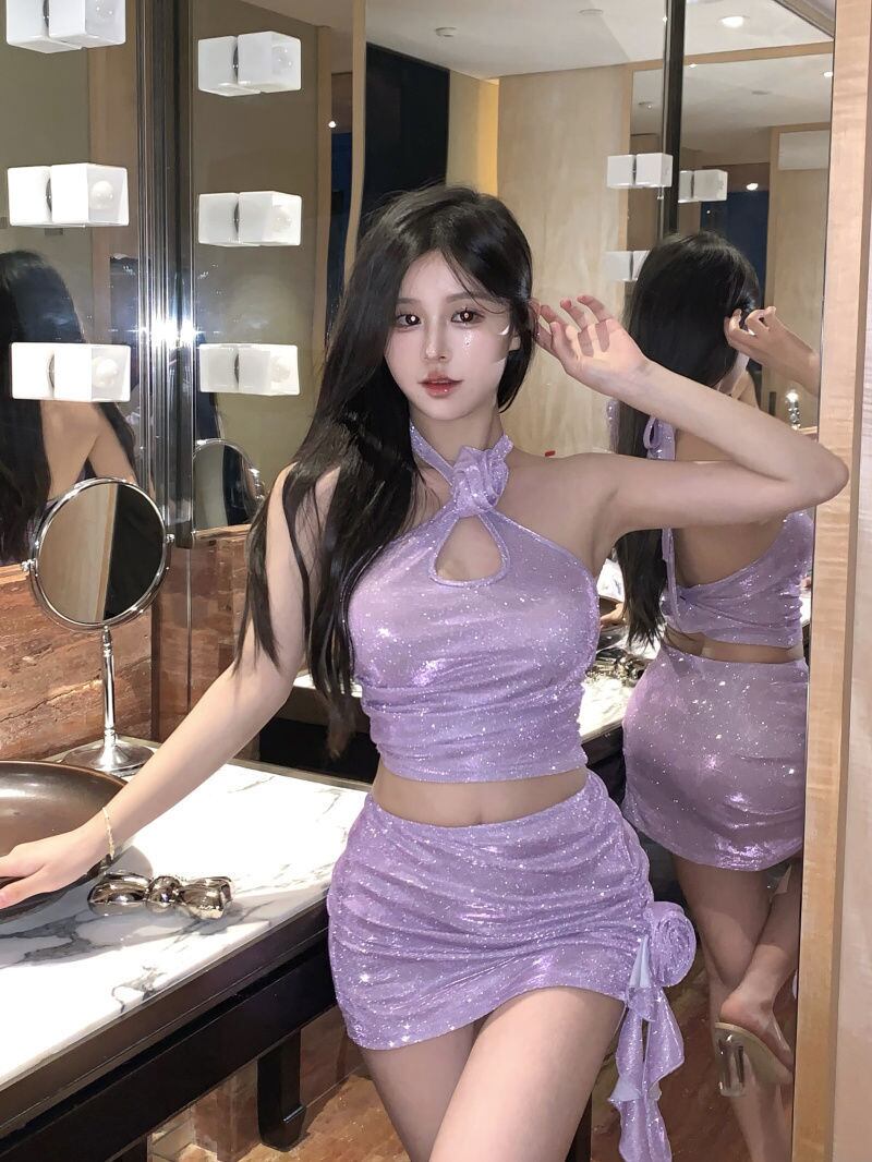 スーツフラワースパイシーガールセット夏中空アウトスリム気質ハンギングネックトップハーフスカート 2 点セット サマー 夏物 フラワーデザイン