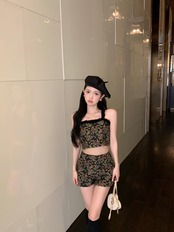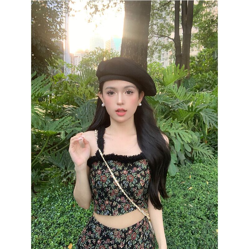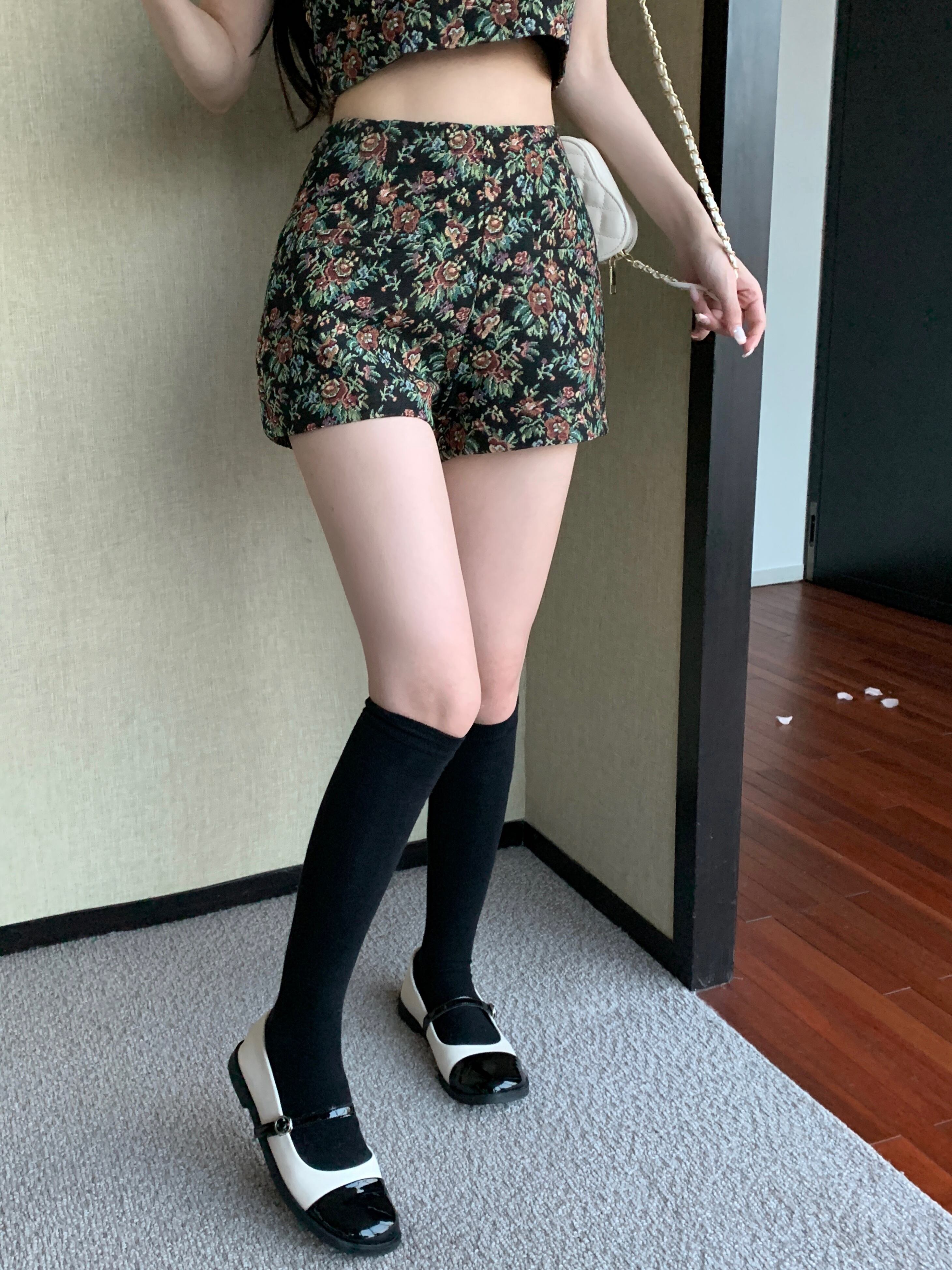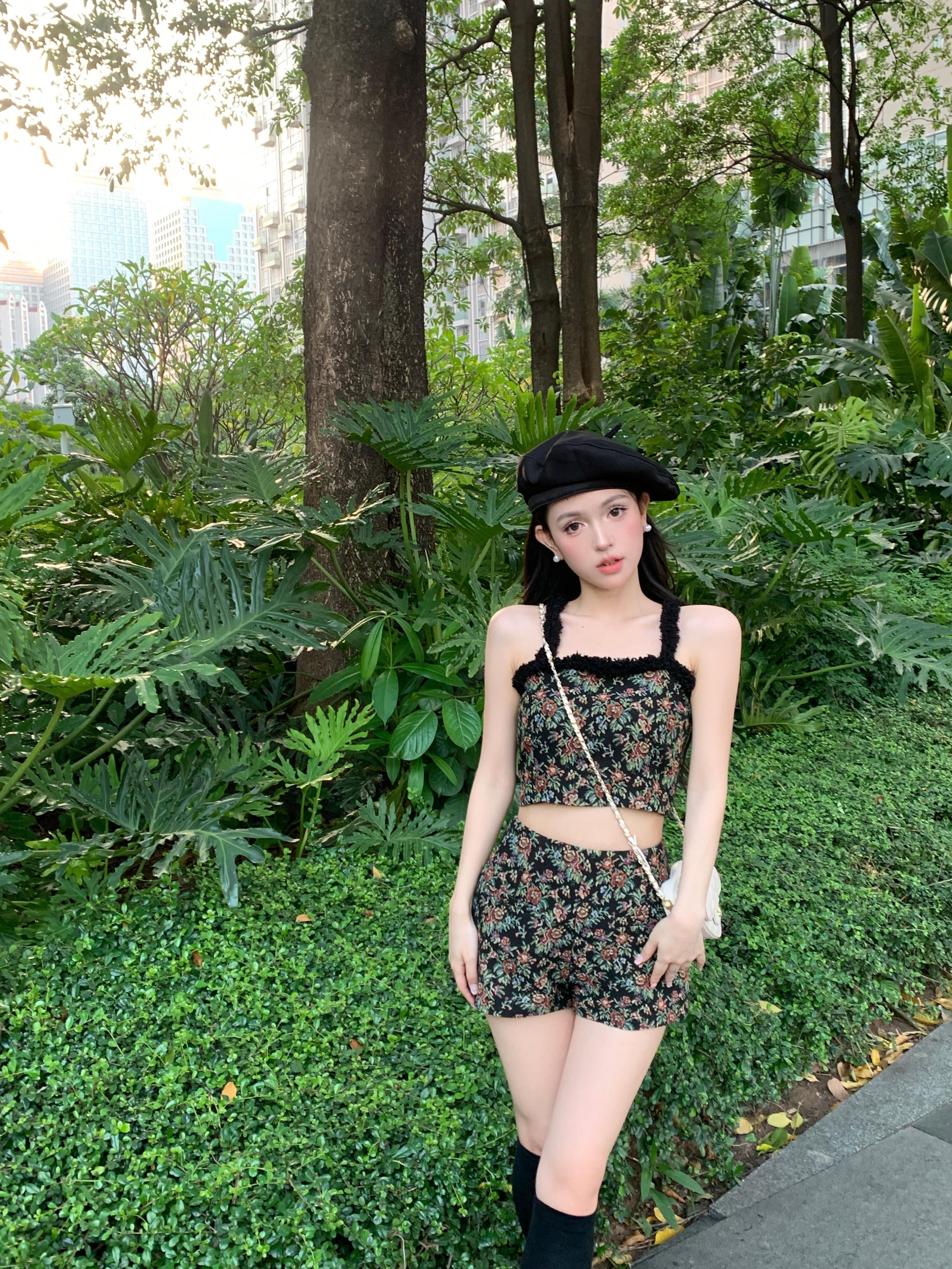 フレンチホットガールジャカードスーツ夏花柄ストラップタンクトップウエストショーツ 2 点セット服 サマー 夏物 ブルマー