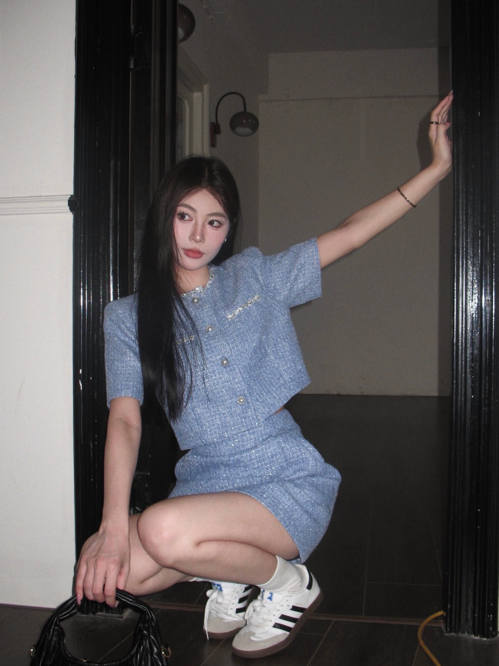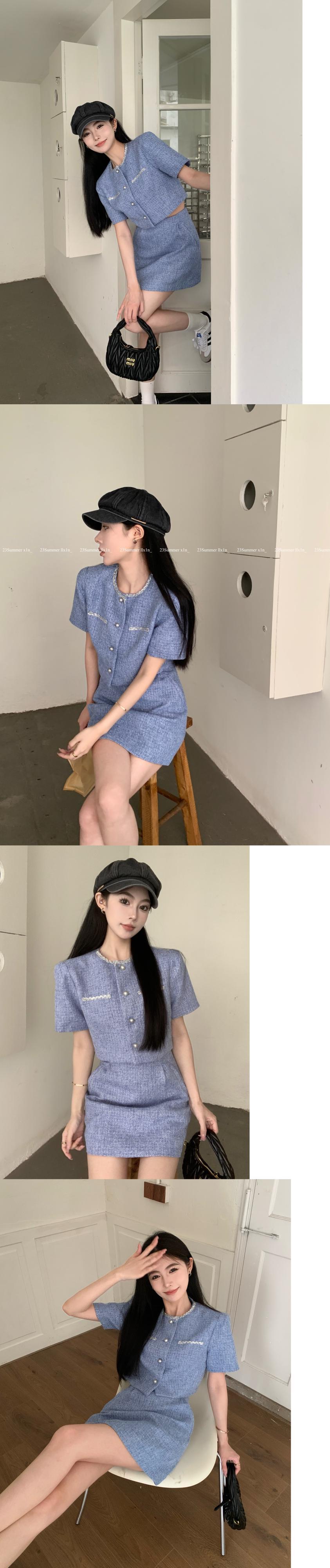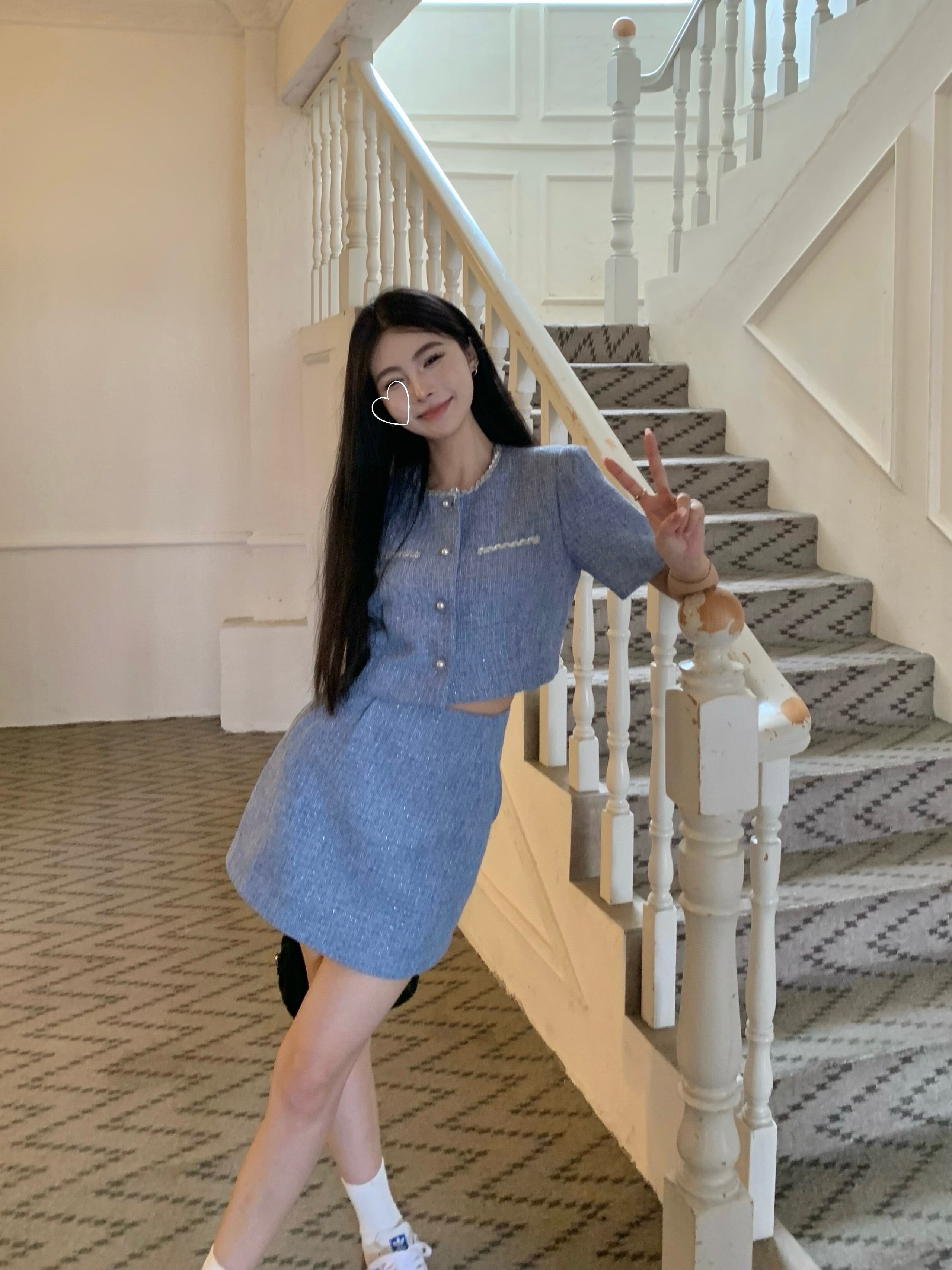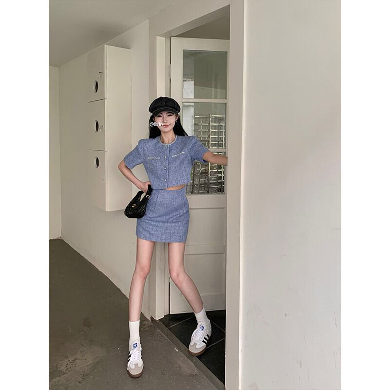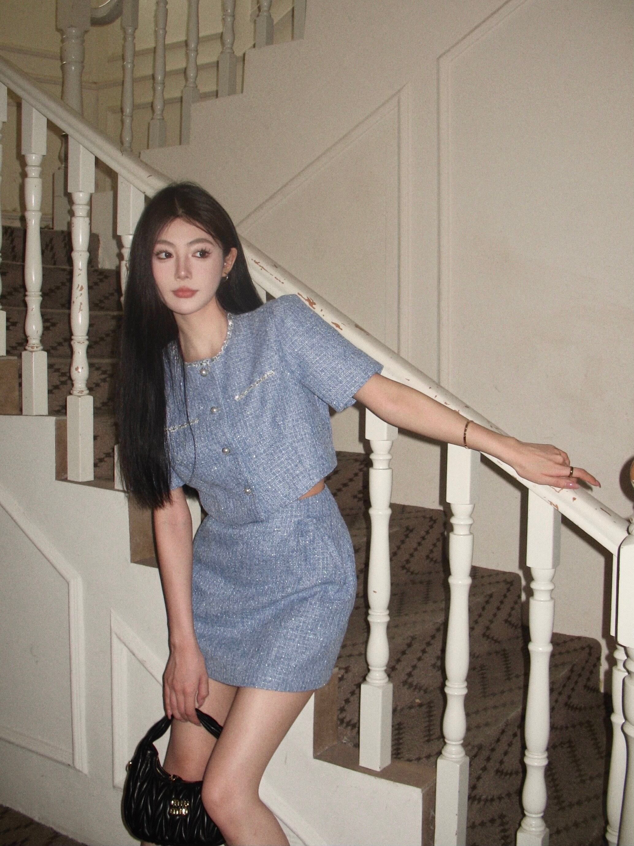 スイートガールスーツ夏ウエストミニスカートレトロ多用途ラウンドネック半袖コート 2 点セット服 大人ガーリー スウィート キュート カジュアル サマー 夏物 Oネック
