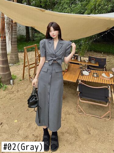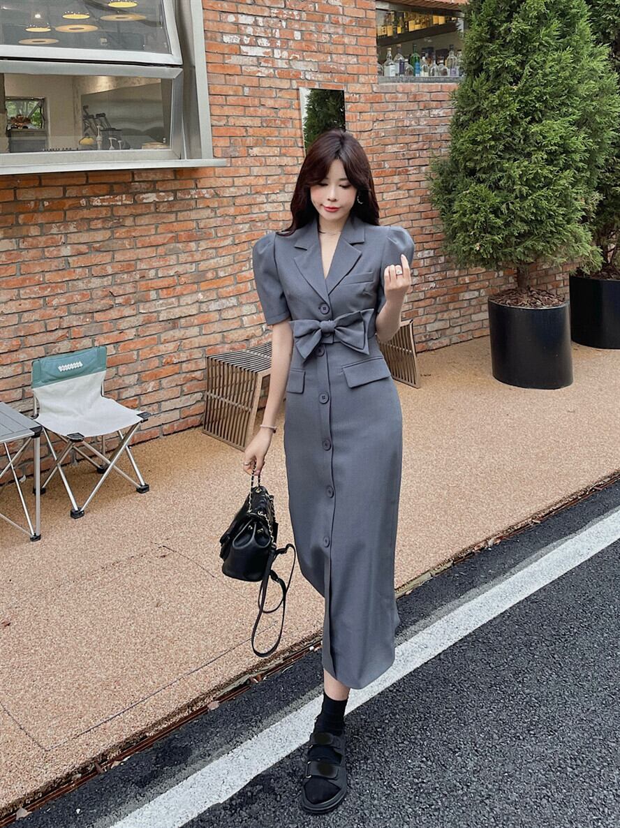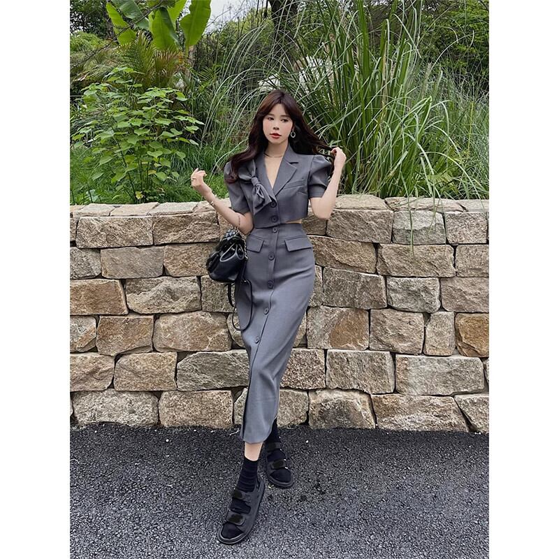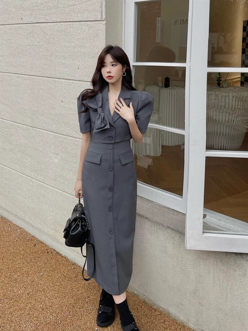 オフィスレディスーツ レディース ターンダウンカラー バブルスリーブ 蝶ネクタイ コート ウエスト ミモレ丈 スカート 2点セット リボン 会社 学校 通勤や通学にも