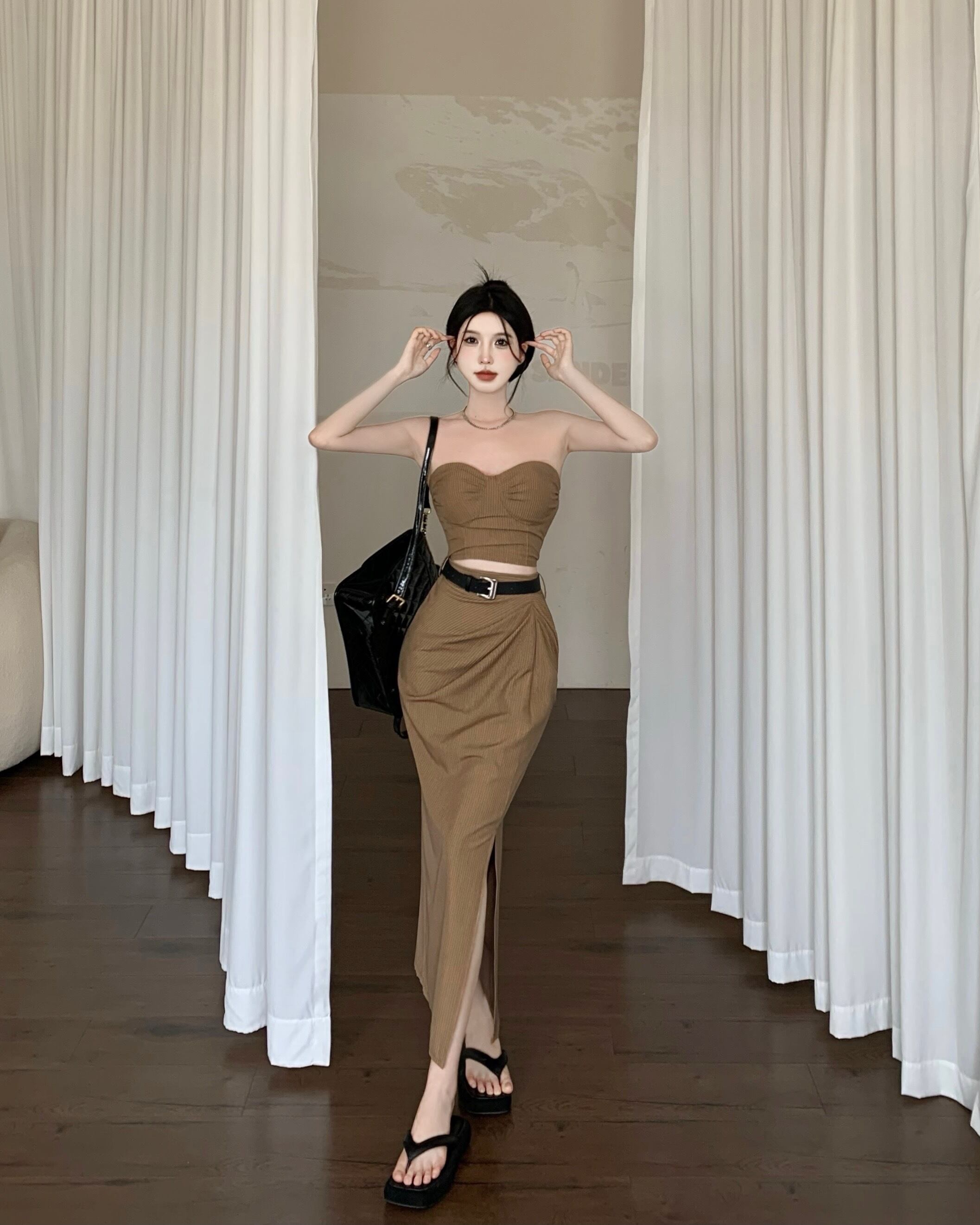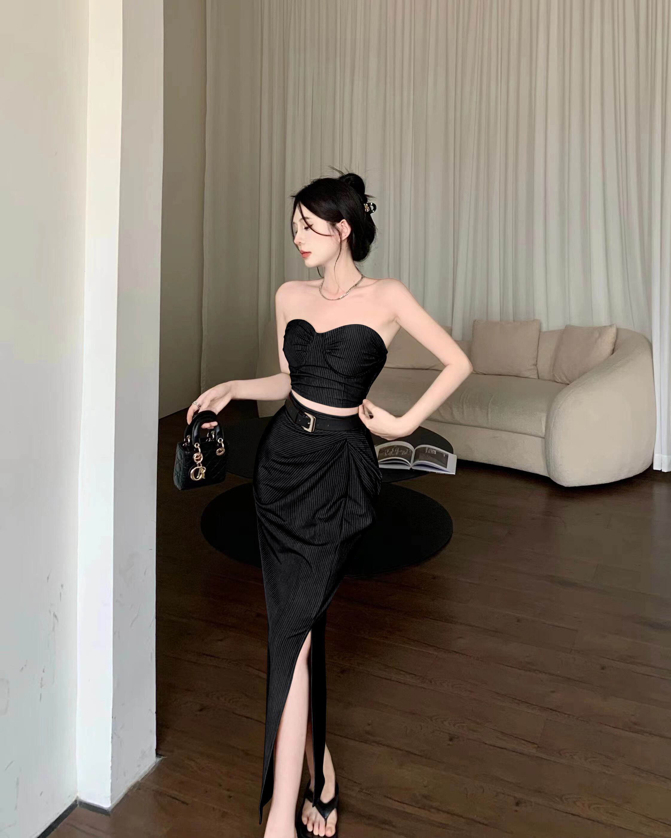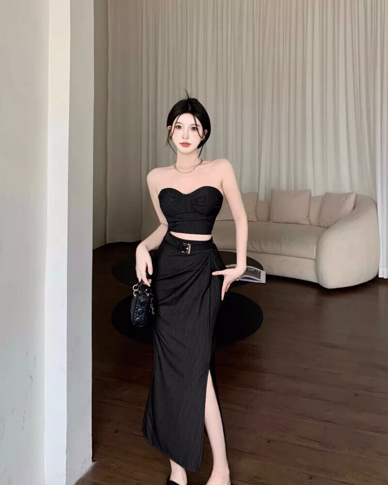 甘いホットガールセクシースーツ夏ストライプタンクトップウエストプリーツラップヒップスプリットミニスカート 2 点セット服 大人ガーリー スウィート キュート カジュアル サマー 夏物