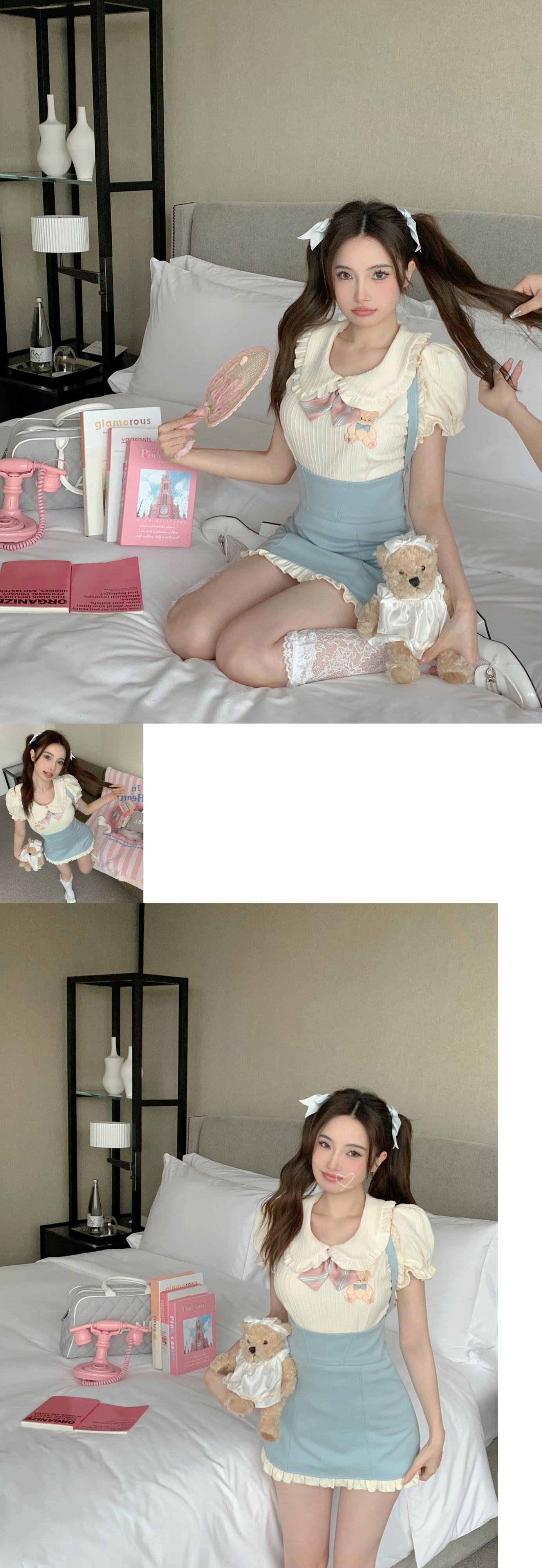 スイートガールスーツ夏ピーターパン襟バブルスリーブショート Tシャツ食用樹菌ラップヒップストラップドレス 2 点セット 大人ガーリー スウィート キュート カジュアル サマー 夏物