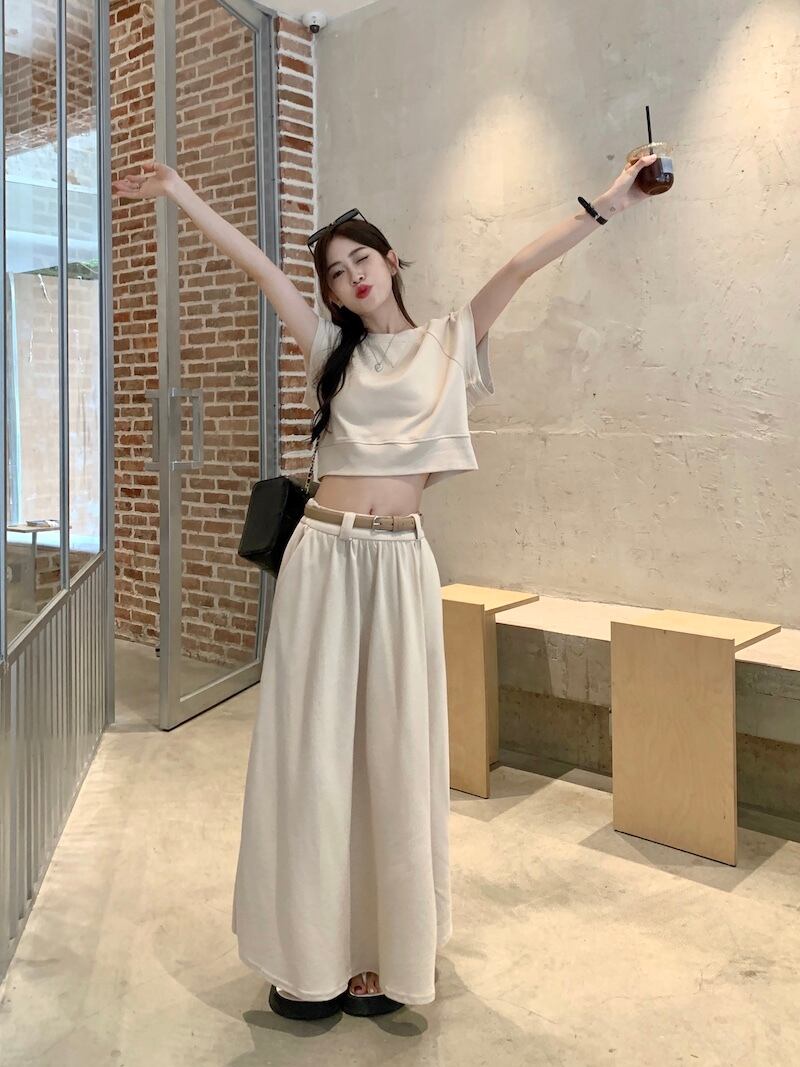 オフィスレディシンプル通勤スーツレディース夏ラウンドネックTシャツウエストロングスカート2点セット服 サマー 夏物 Oネック 会社 学校 通勤や通学にも