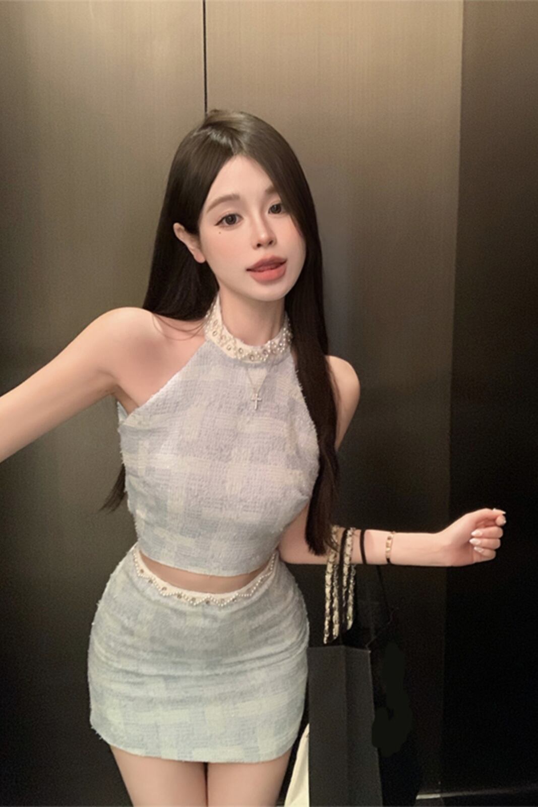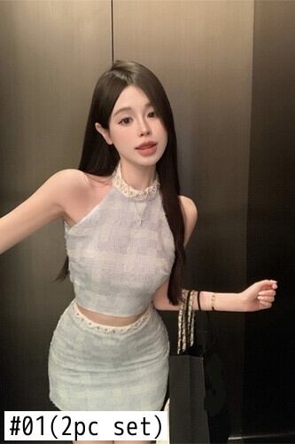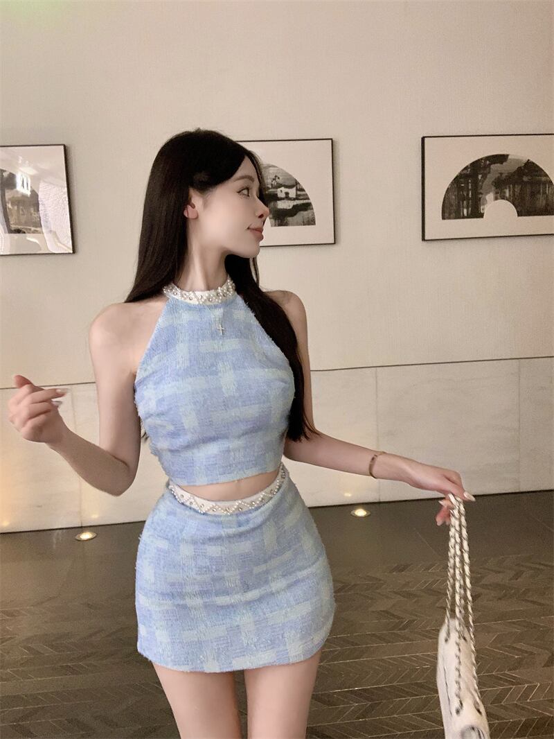 スイートホットガールスーツ夏ジッパーショートホルターネックタンクトップピンビーズミニスカートツーピースセット服 大人ガーリー スウィート キュート カジュアル サマー 夏物