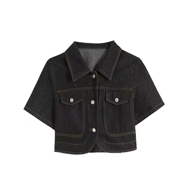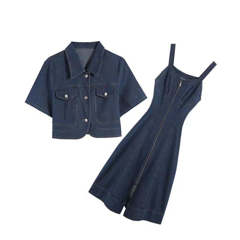 甘いホットガールスーツ夏ターンダウン襟半袖デニムトップスリムフィットサスペンダードレス 2 点セット 大人ガーリー スウィート キュート カジュアル サマー 夏物