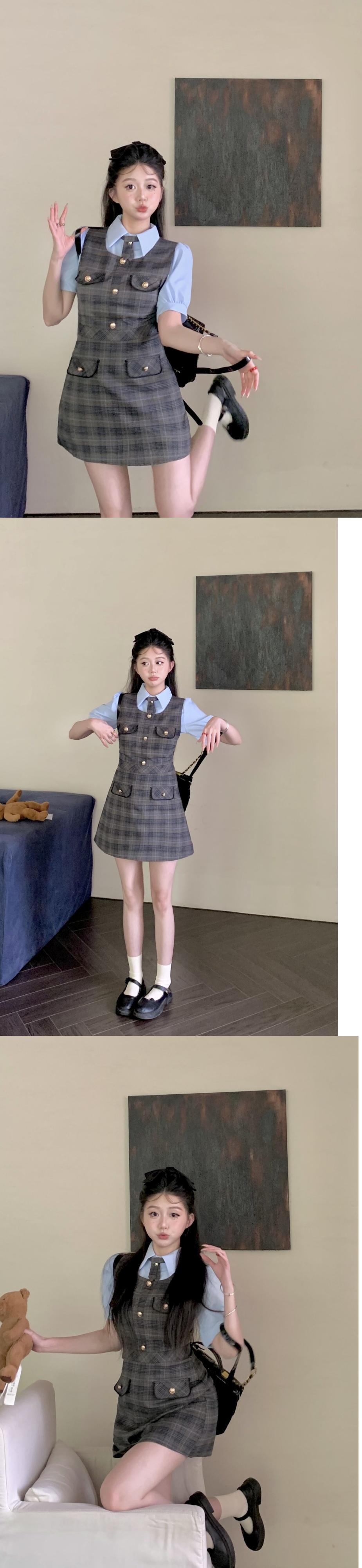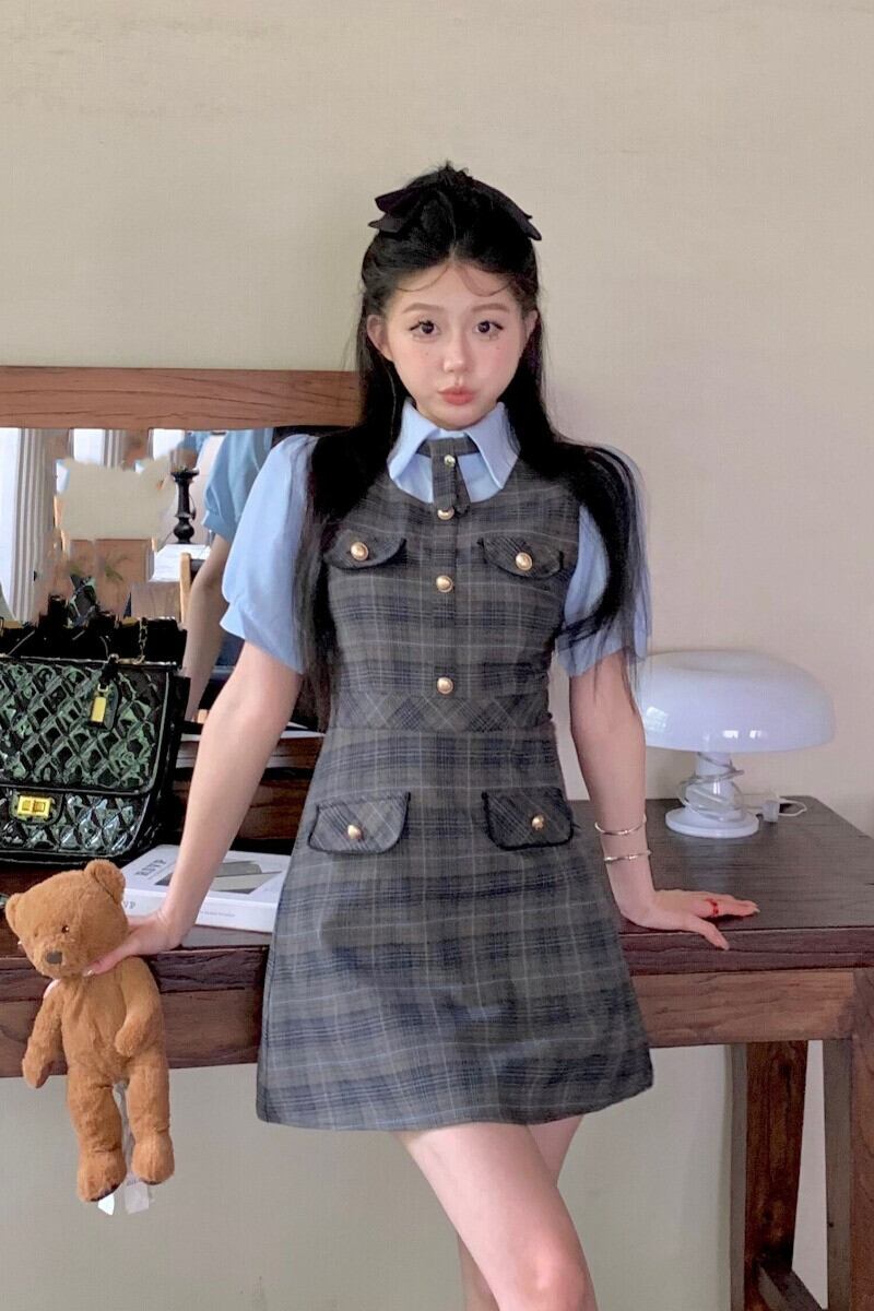 スイートホットガールスタイルスーツ夏半袖ブルーシャツチェック柄ストラップドレスツーピースセット服 大人ガーリー スウィート キュート カジュアル サマー 夏物