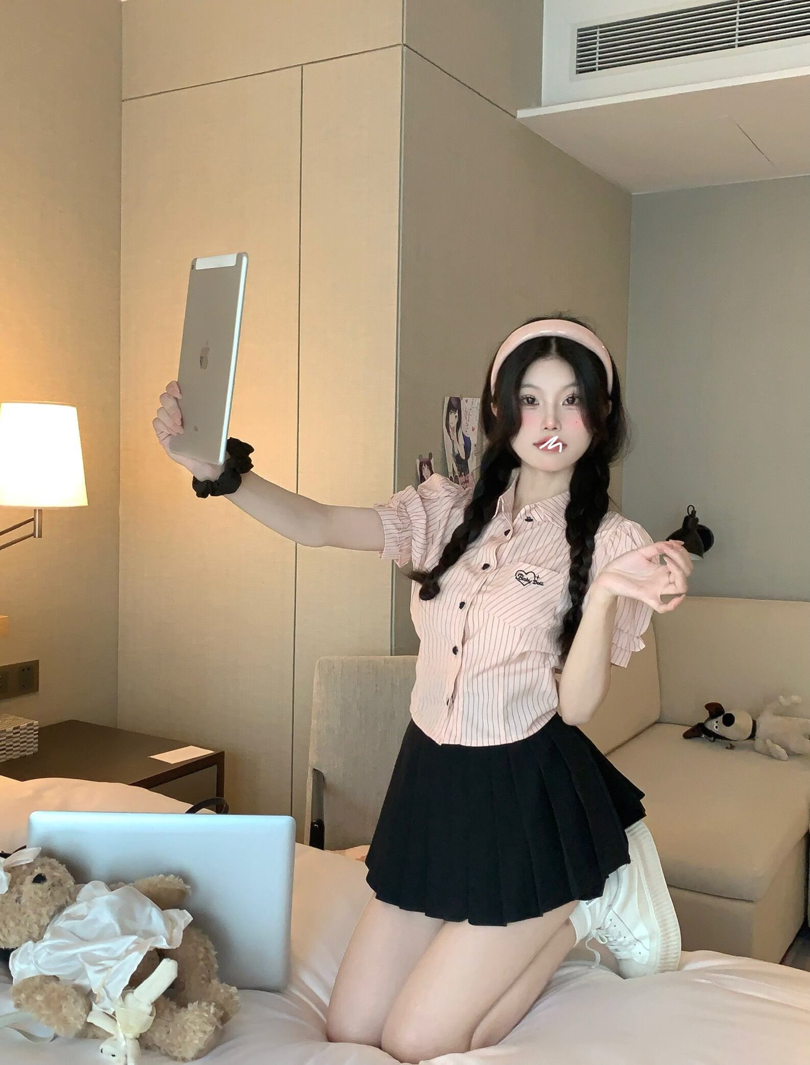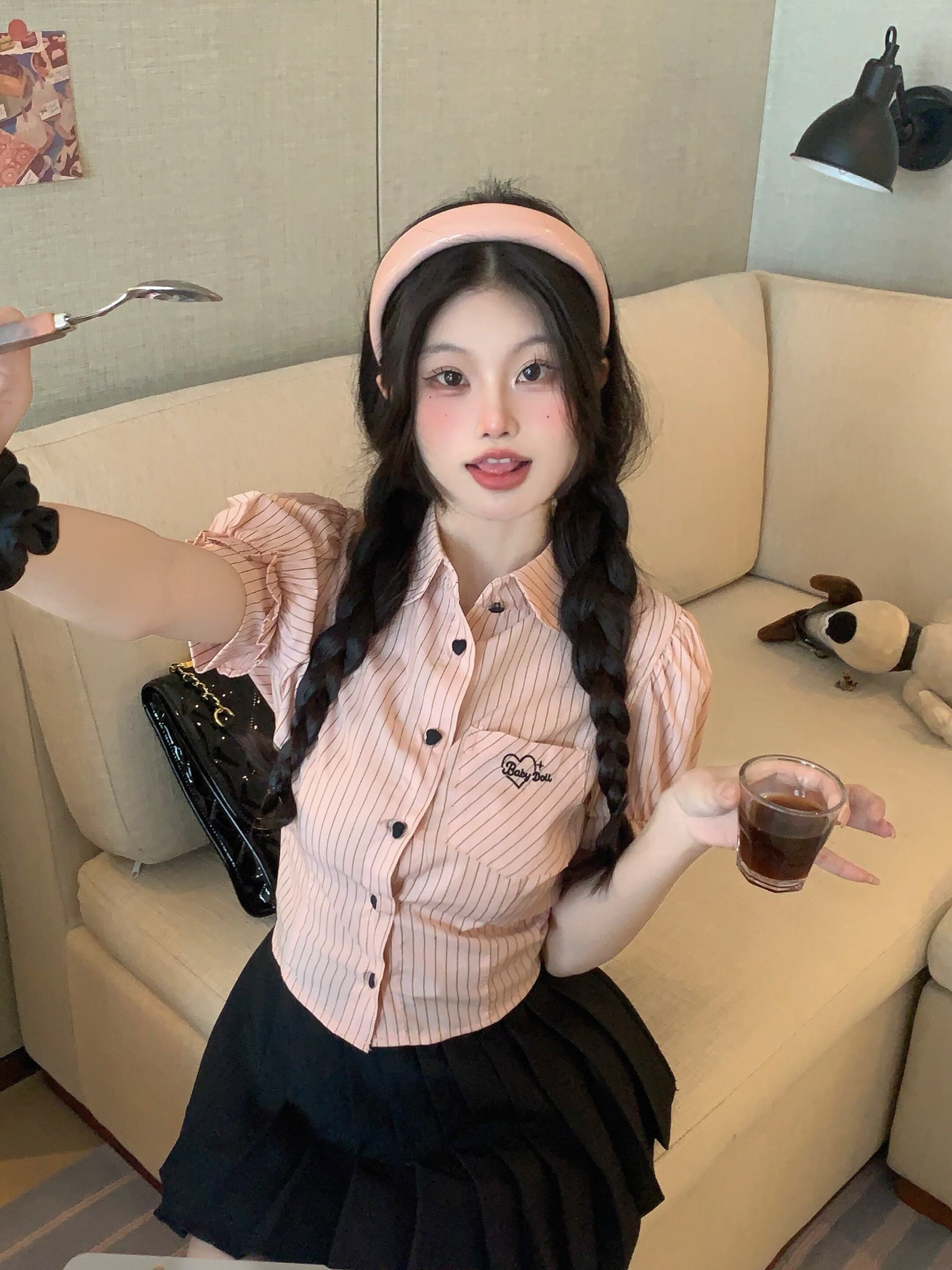プレッピースタイルスウィートガールスーツ夏ピンクストライプシャツ黒プリーツスカートツーピースセット服 ブラック 大人ガーリー キュート カジュアル サマー 夏物