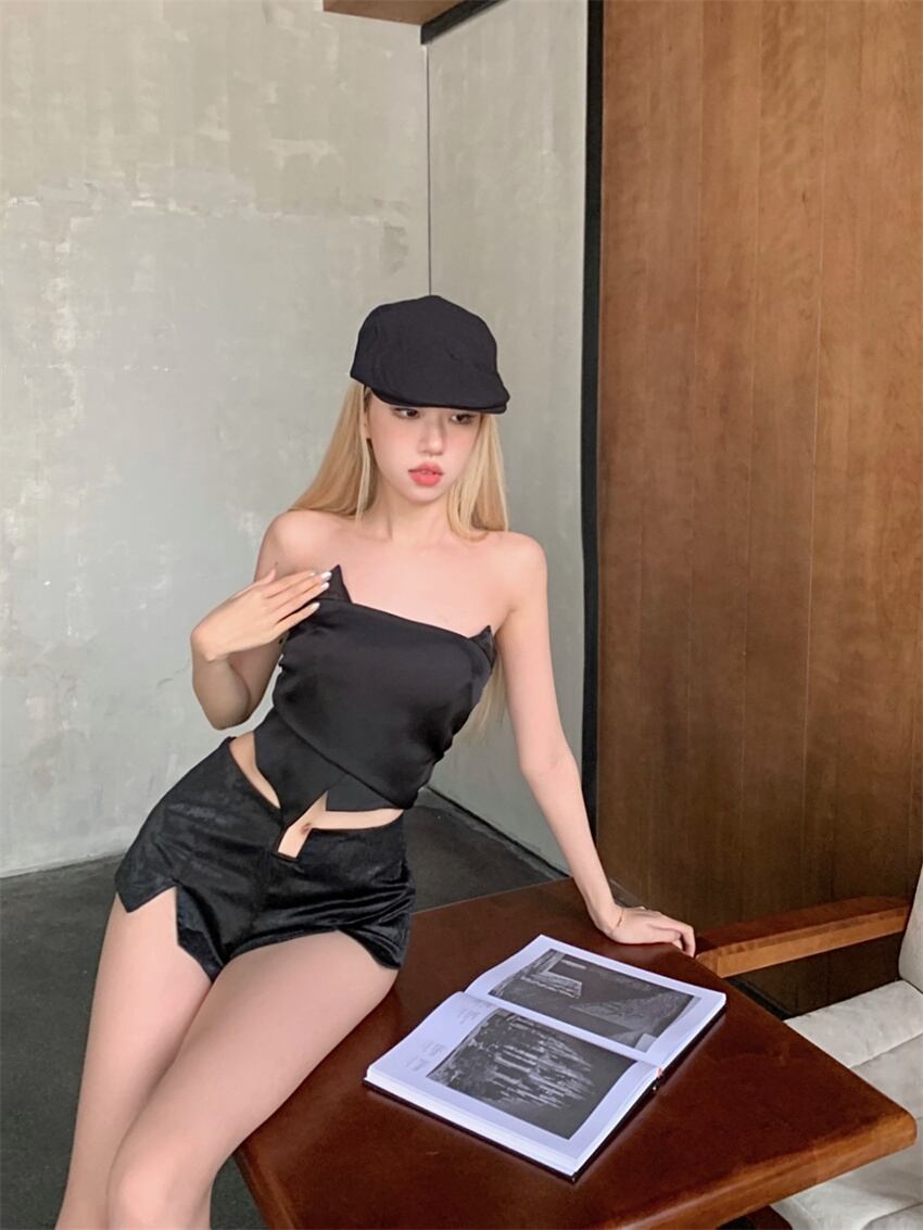 ブラックホットガールスーツ夏ストラップレススリムフィットタンクショートトップウエストショーツツーピースセット服 サマー 夏物 ブルマー
