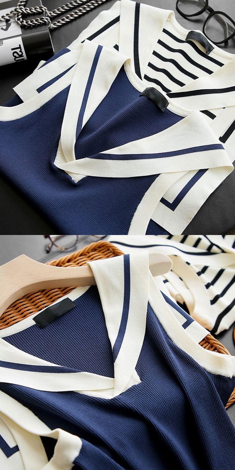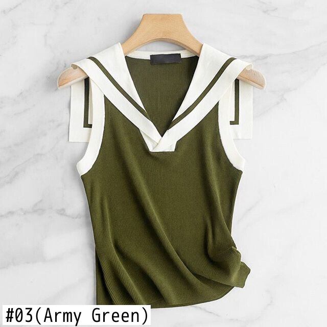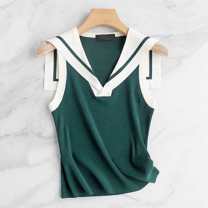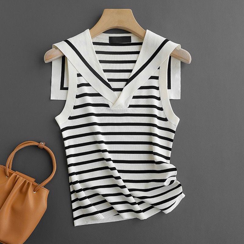 甘いホットガールセーラー襟ストライプカラーマッチングノースリーブベストニットシャツ夏スリムフィット多用途トップ 大人ガーリー スウィート キュート カジュアル サマー 夏物