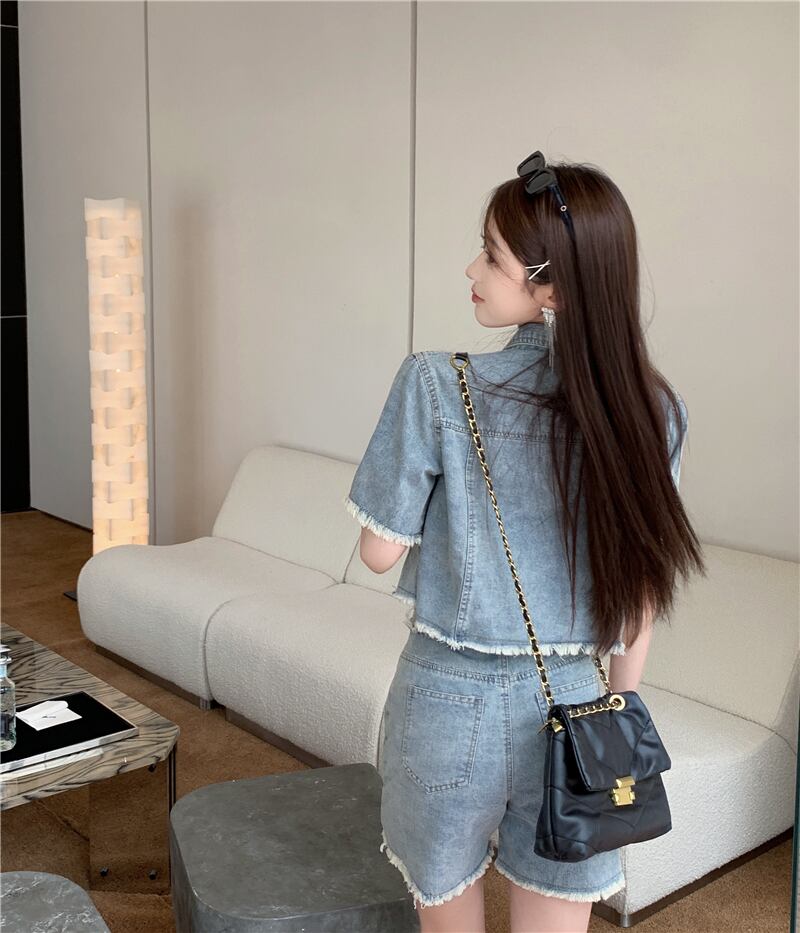 アメリカンホットガールデニムスーツ夏半袖コートウエストショーツツーピースセット服 サマー 夏物 ブルマー