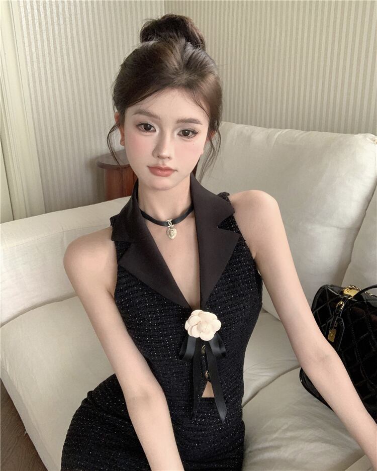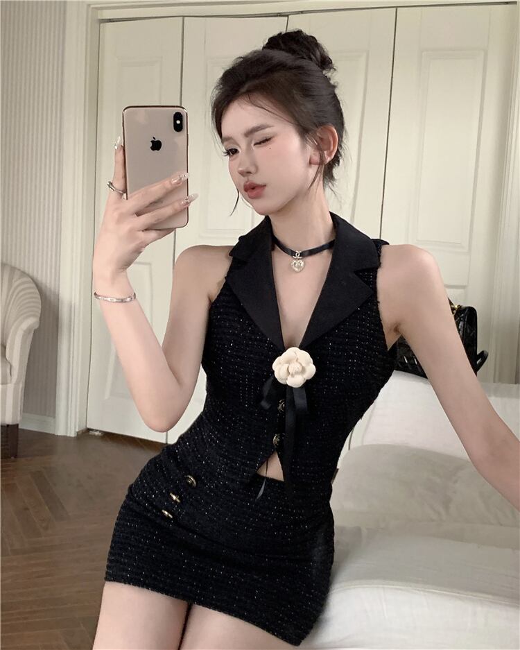 フレンチスイートホットガールスーツ夏ホルターネックタンクトップウエストミニスカートスリムツーピースセット服 大人ガーリー スウィート キュート カジュアル サマー 夏物