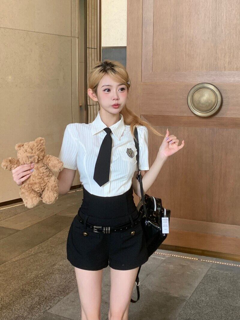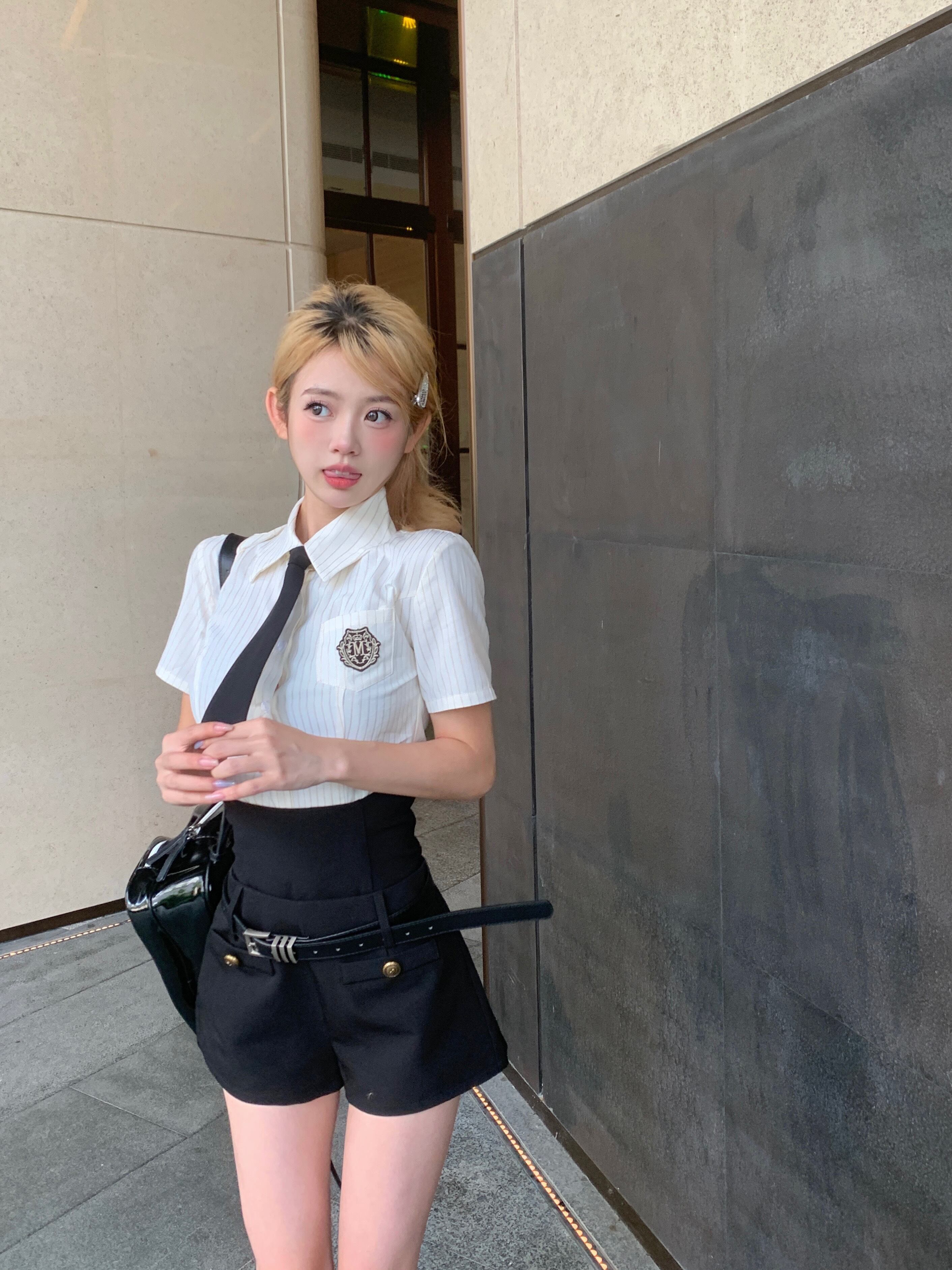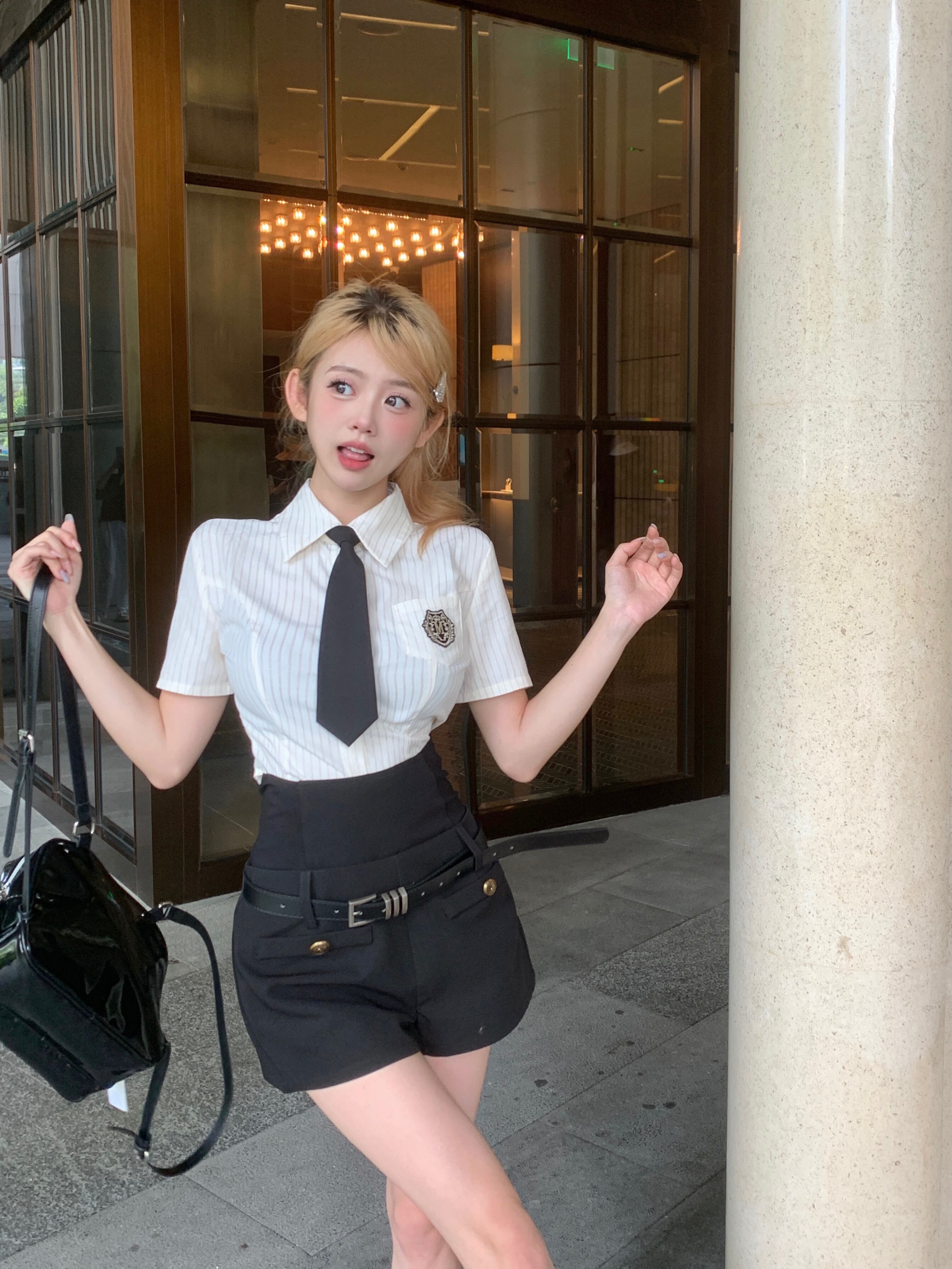 ホットガールズスタイルスーツ夏ストライプ半袖シャツトップショーツツーピースセット服 サマー 夏物 ブルマー