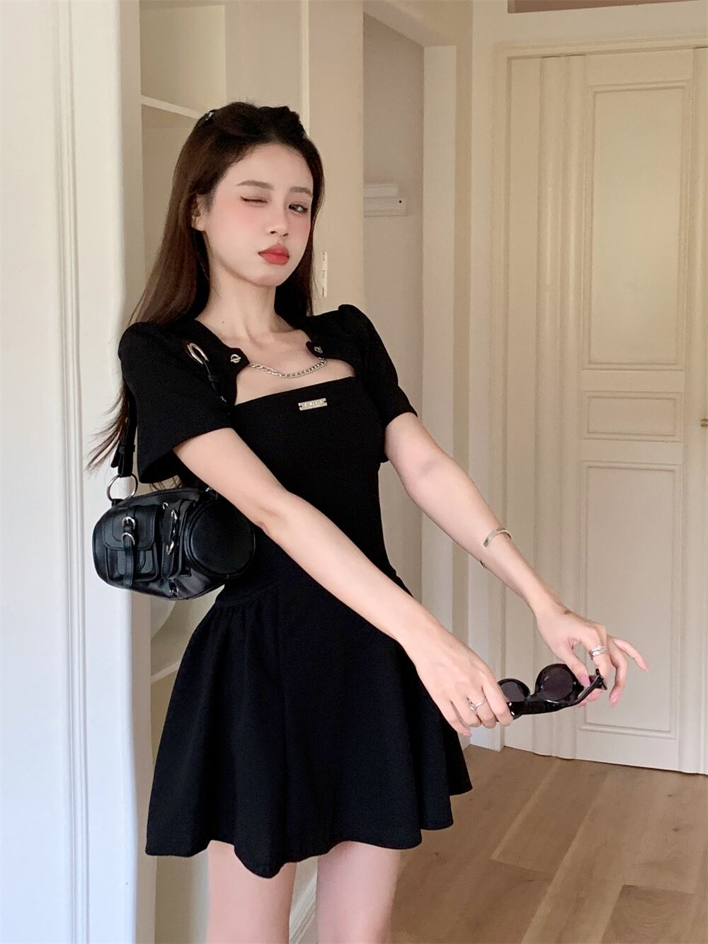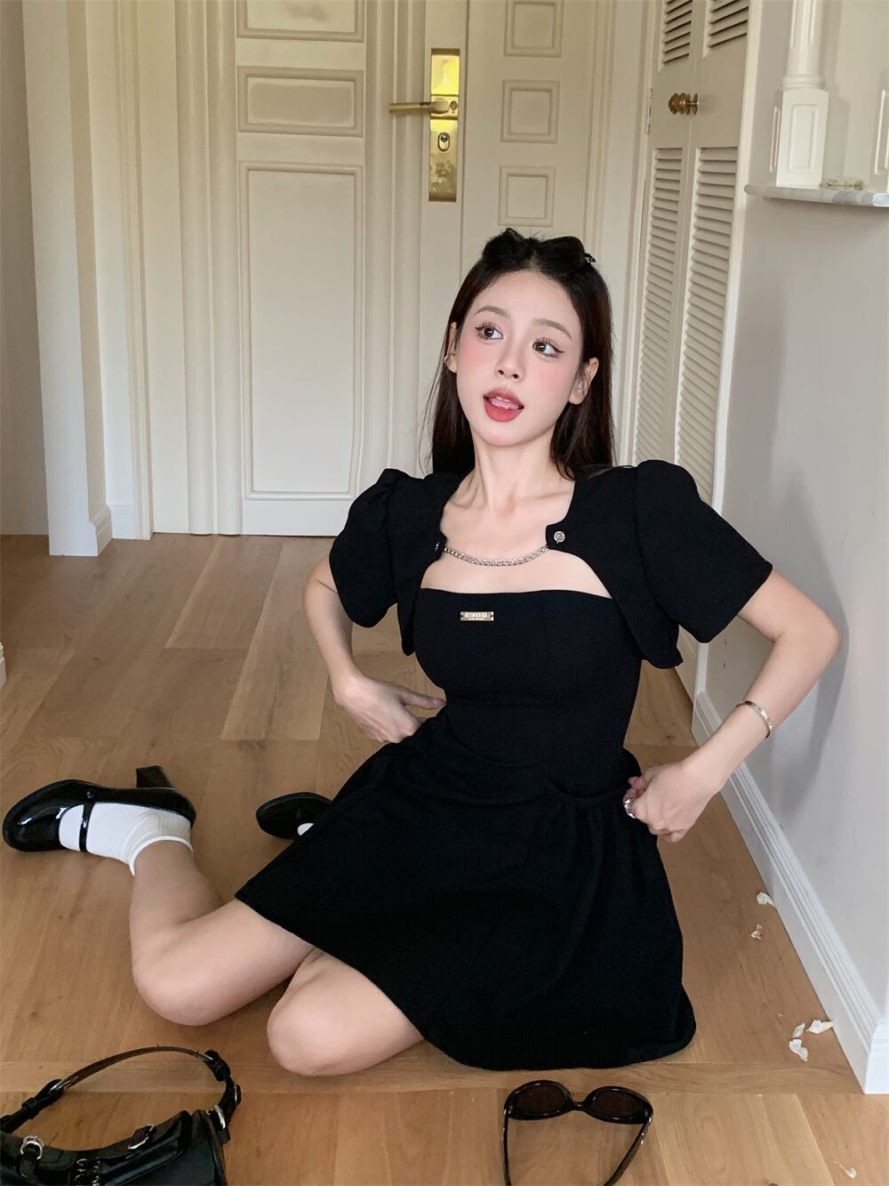 ホットガールズスタイルスーツ夏黒半袖ショールコートストラップレスショートドレスツーピースセット服 ブラック サマー 夏物