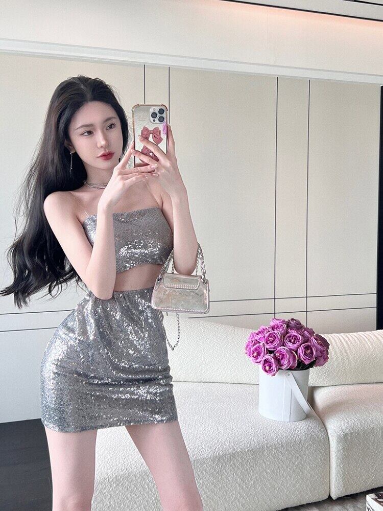 ホットガールシルバースパンコール純粋セクシードレスストラップレスオフウエストスリムフィットショートドレスクラブイブニング服 ピュア 銀