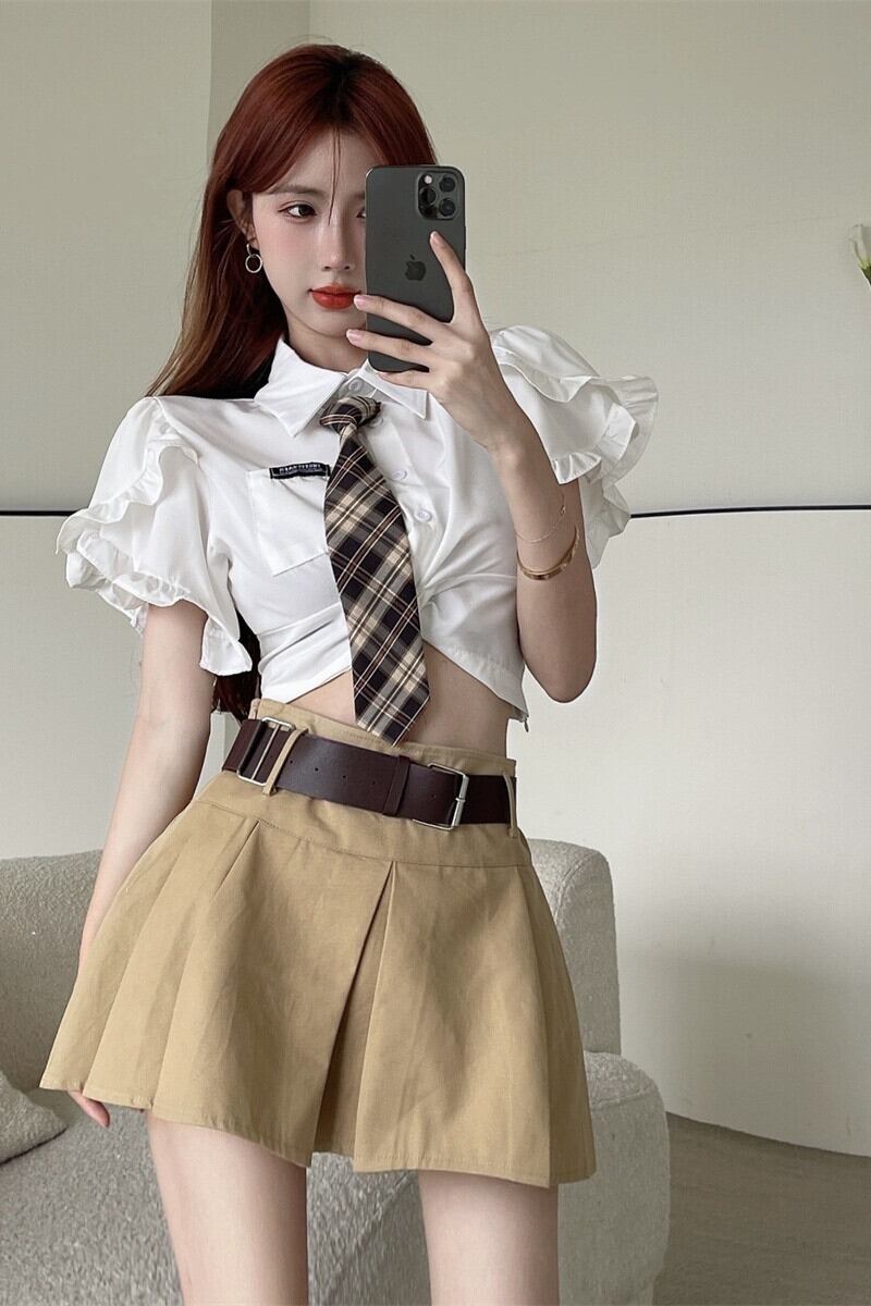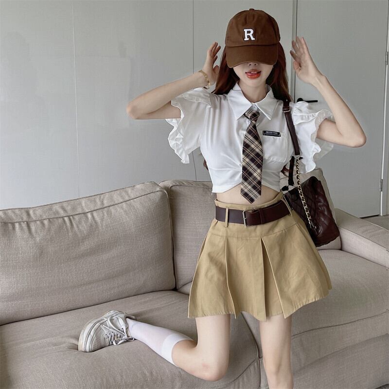 ブラウス スカート セット ホットガール スーツ サマー プレッピー スタイル 半袖 ネクタイ シャツ スリム プリーツ スカート ツーピース スーツ ショート ハーフスリーブ 夏物