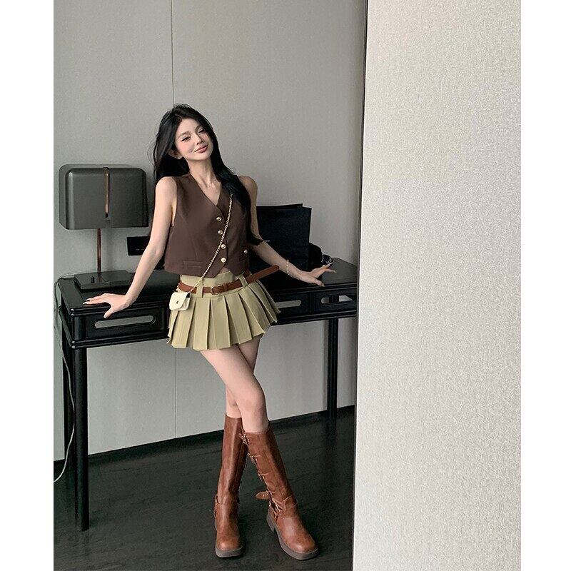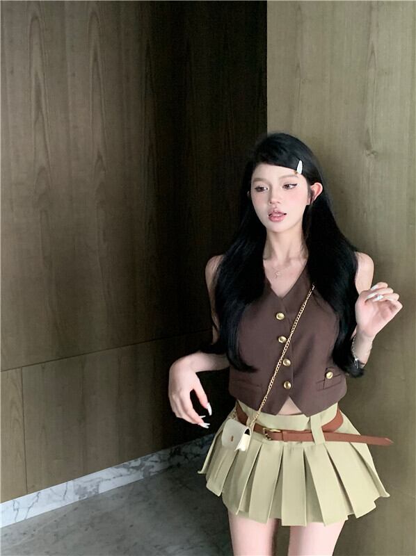 甘いホットガールレトロスーツ夏ノースリーブベストプリーツラップヒップスカートショーツ 2 点セット服 大人ガーリー スウィート キュート カジュアル サマー 夏物 ブルマー