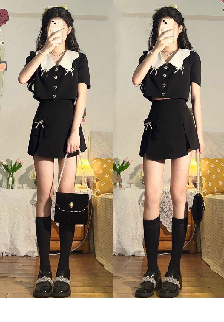 スイートガールスーツ レディース 香港スタイル ターンダウンカラー ボウコート トップ ウエスト Aライン スカート 2点セット 服 リボン 大人ガーリー スウィート キュート カジュアル