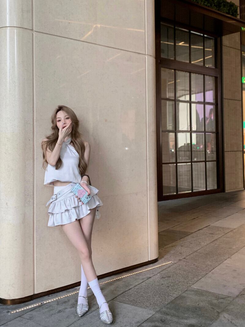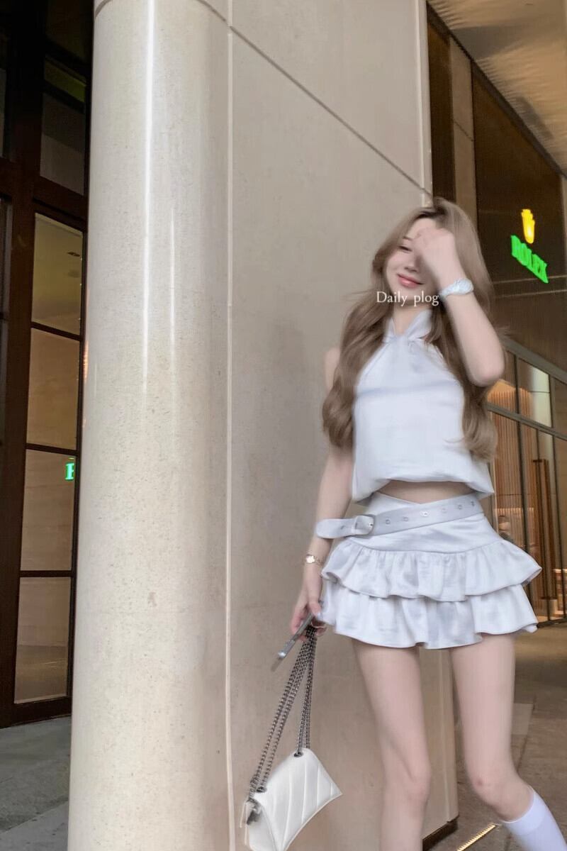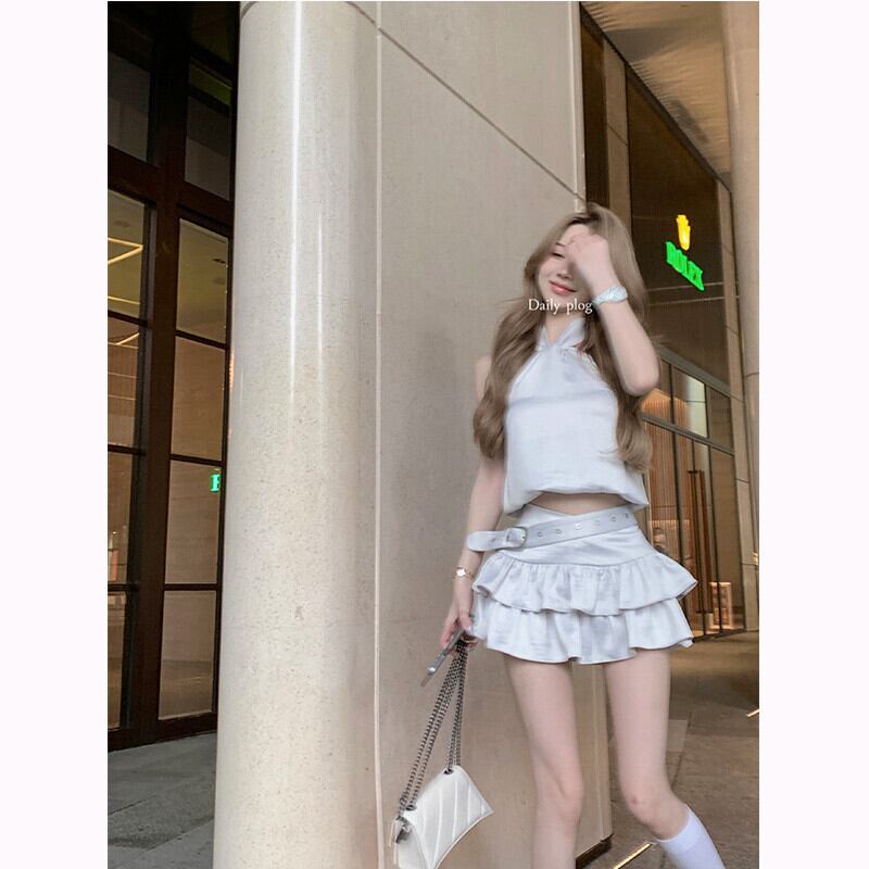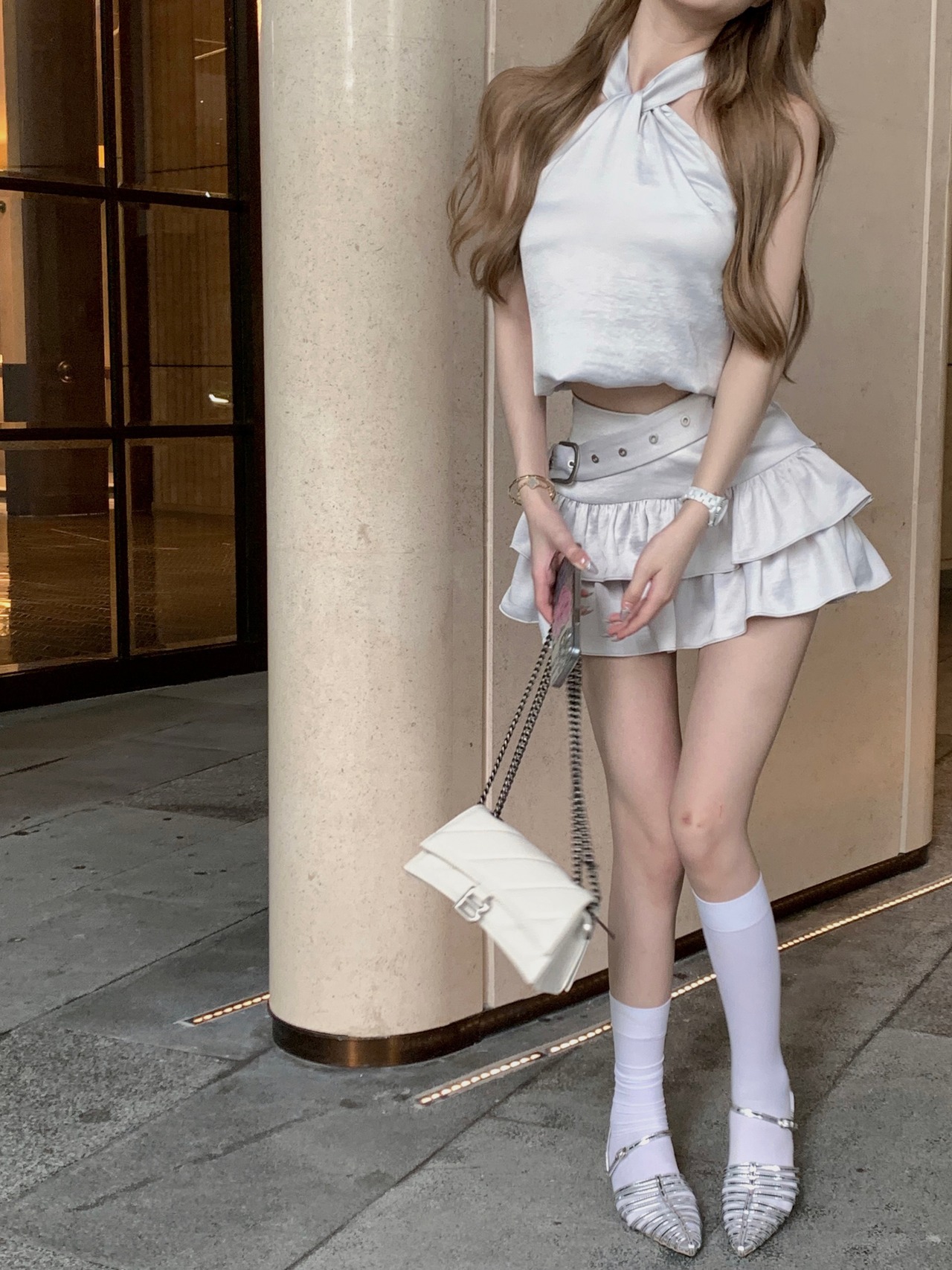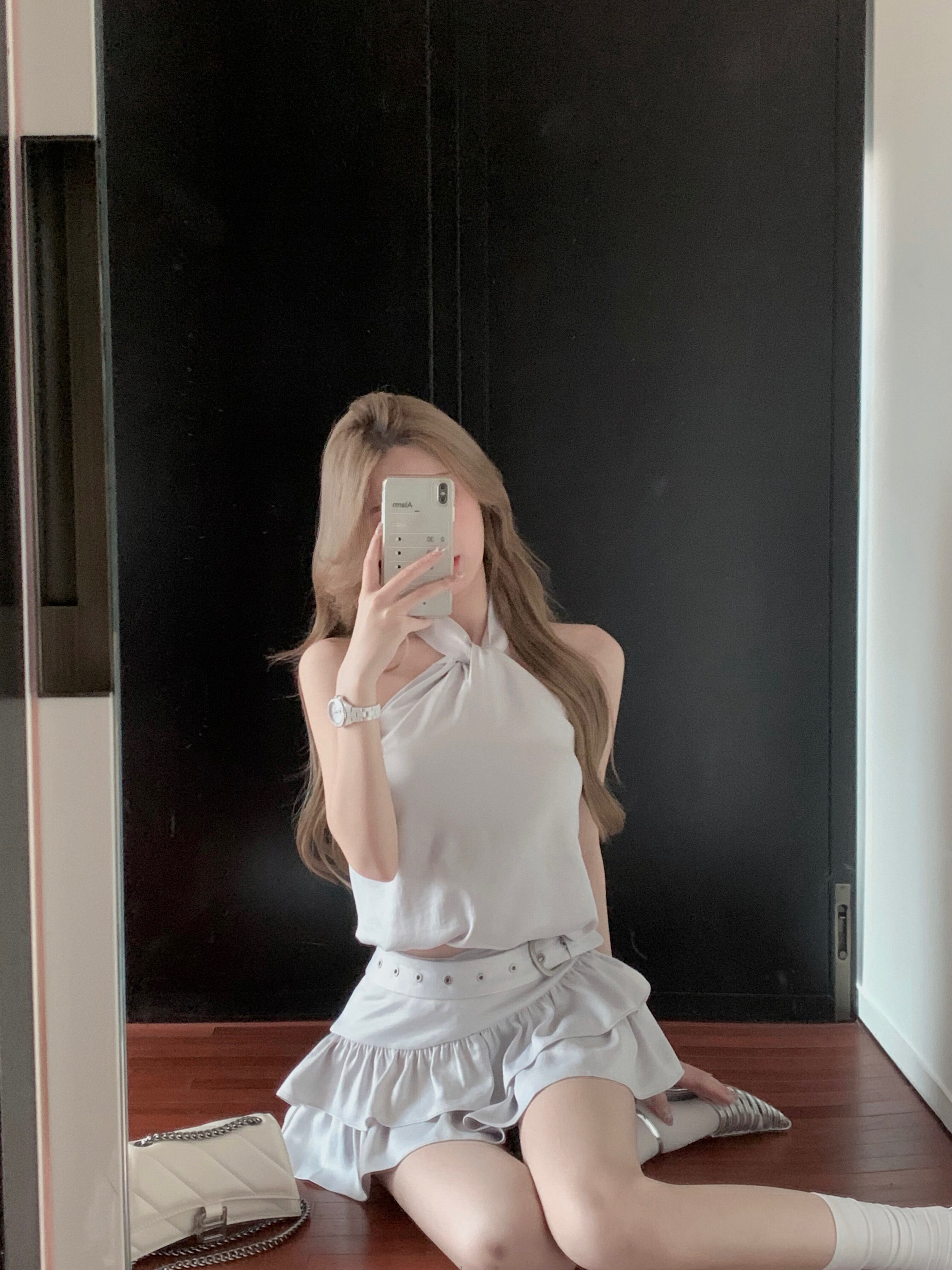 ホットガールスーツ レディース 夏 シルバー ホワイト サテン ツイストネック 花つぼみ ストラップ ウエストケーキ ミニスカート 2点セット サマー 夏物 フラワーデザイン 銀