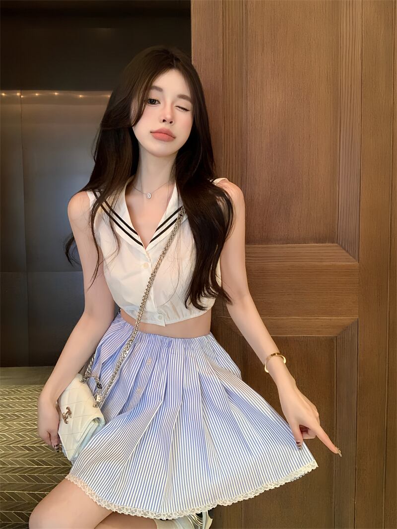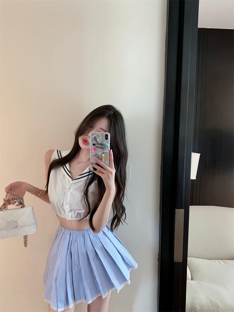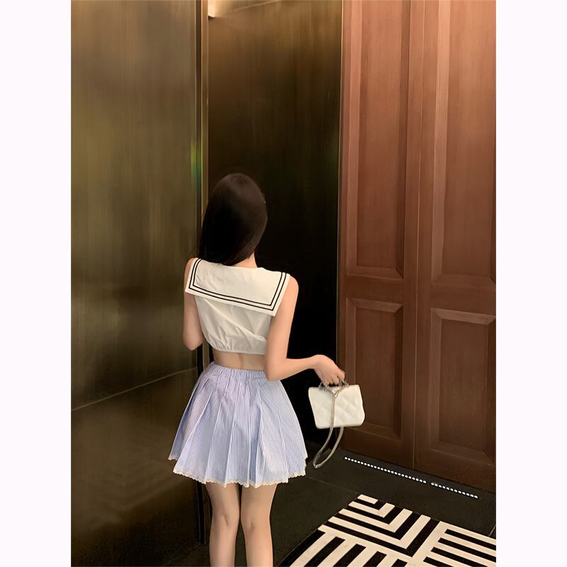 甘いホットガールスーツ夏セーラー襟ノースリーブトップウエスト A ラインプリーツスカート 2 点セット服 大人ガーリー スウィート キュート カジュアル サマー 夏物 Aライン
