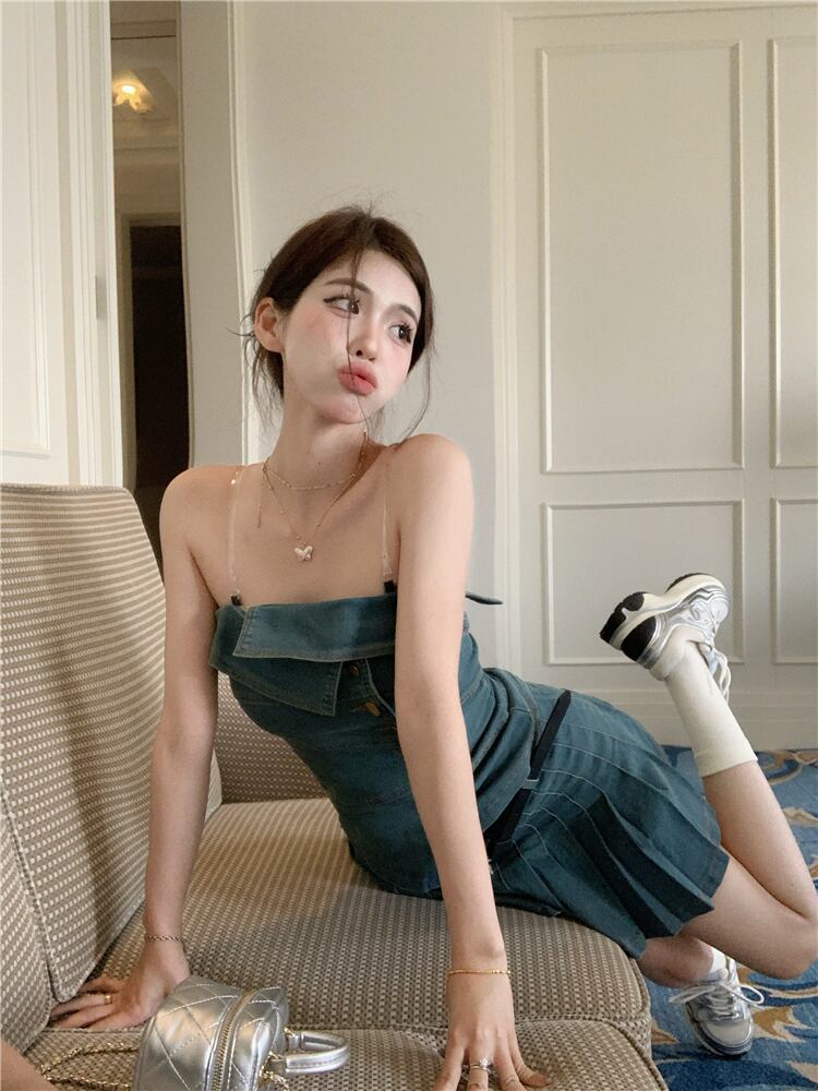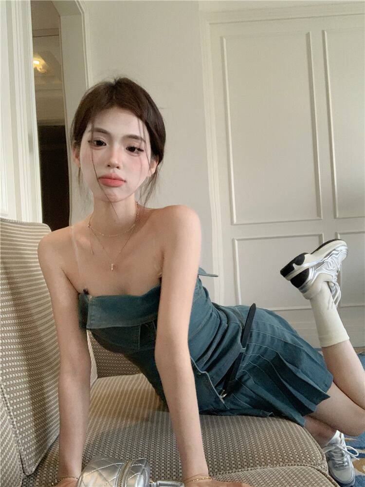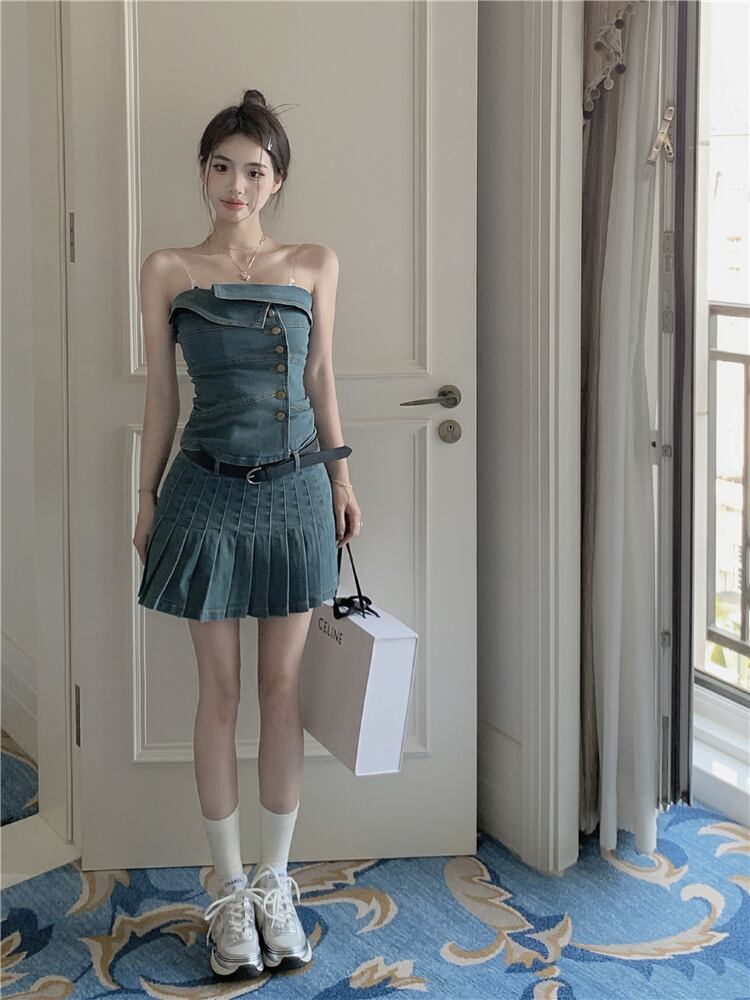 ホットガールズスーツ夏デニムストラップレススリムフィットトップウエストプリーツショートスカートツーピースセット服 サマー 夏物