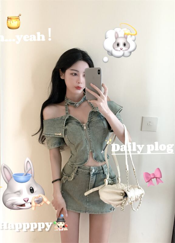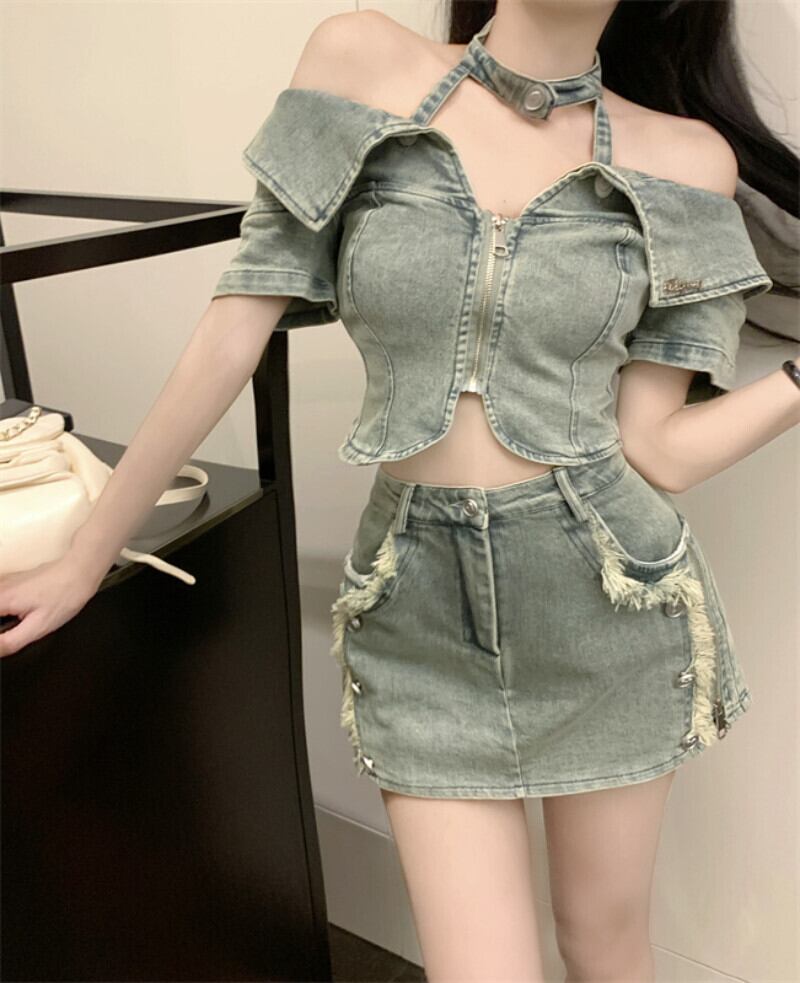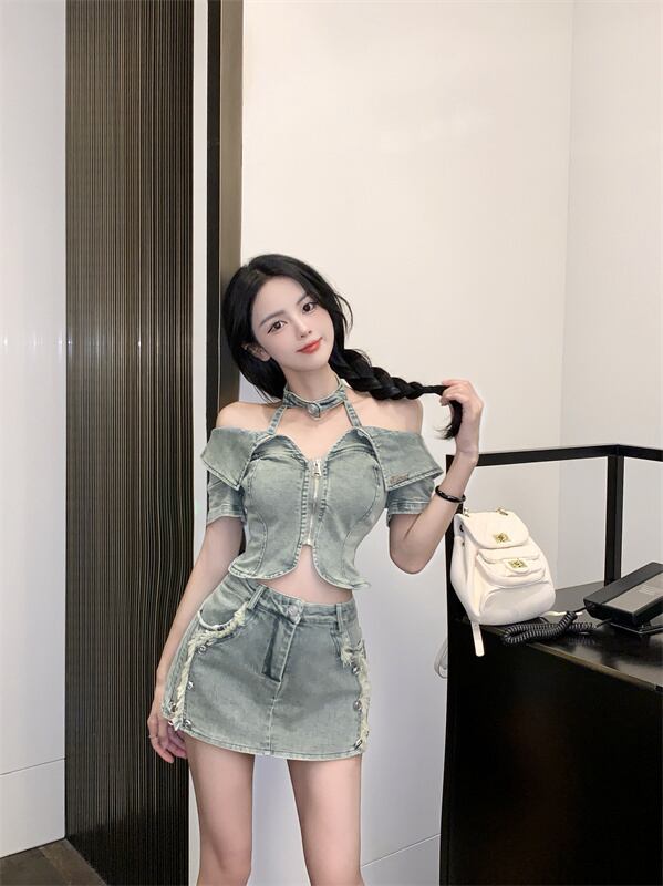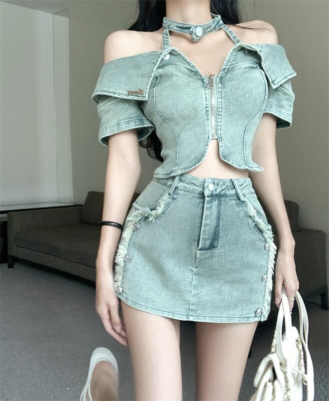 ホットガールズスーツ夏ホルターネックカーディガンセクシートップスリムフィットボタンミニスカートツーピースセット服 サマー 夏物