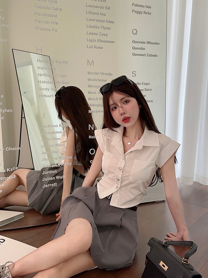 スタイルスイートホットガールスーツ夏白シャツグレープリーツショートスカートツーピースセット服 ホワイト 大人ガーリー スウィート キュート カジュアル サマー 夏物