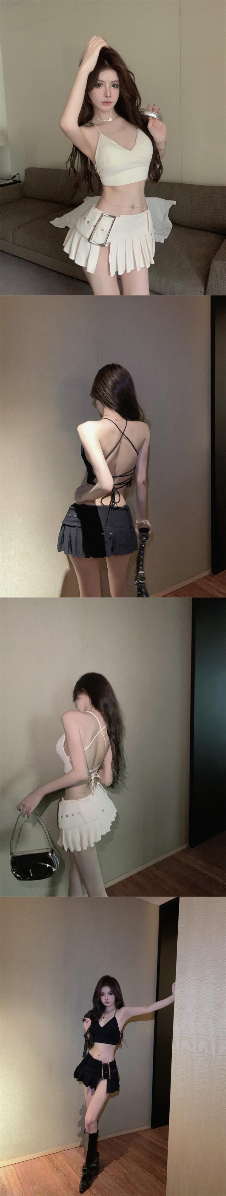 ホットガールズクールセクシースーツ夏 V ネックショートストラップトッププリーツ A ラインミニスカート 2 点セット服 サマー 夏物 Vネック Aライン