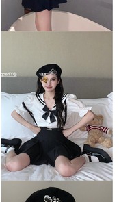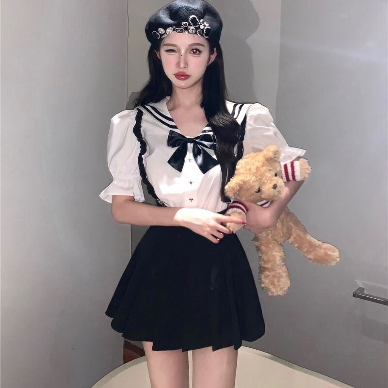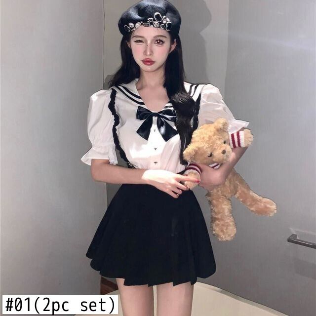 スタイルスーツセーラー襟バブルスリーブシャツ夏ストラップ A ラインプリーツスカート 2 点セット服 サマー 夏物 Aライン
