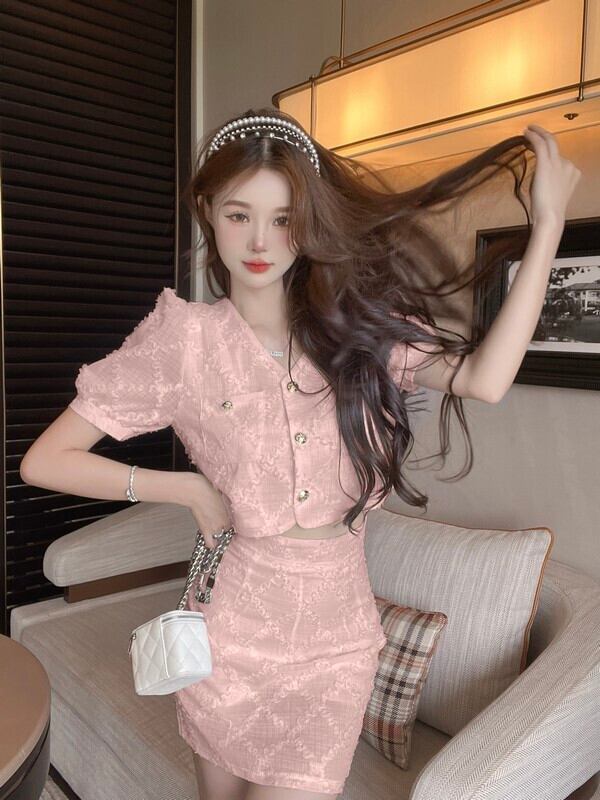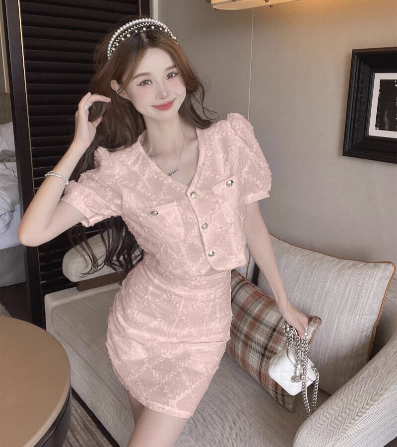 Sweet Hot Gir スーツ夏 V ネックバブルスリーブレースショートトップウエストスカート 2 点セット服 大人ガーリー スウィート キュート カジュアル サマー 夏物 Vネック