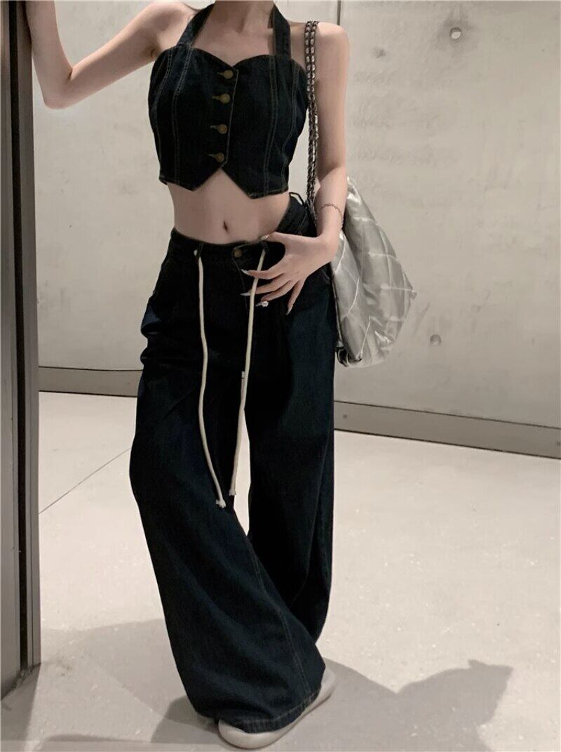 ホットガールレトロ純粋セクシーデニムスーツ夏ホルターネックストラップタンクトップルーズウエストワイド脚パンツ 2 点セット サマー 夏物 ワイドレッグ ワイドパンツ ピュア