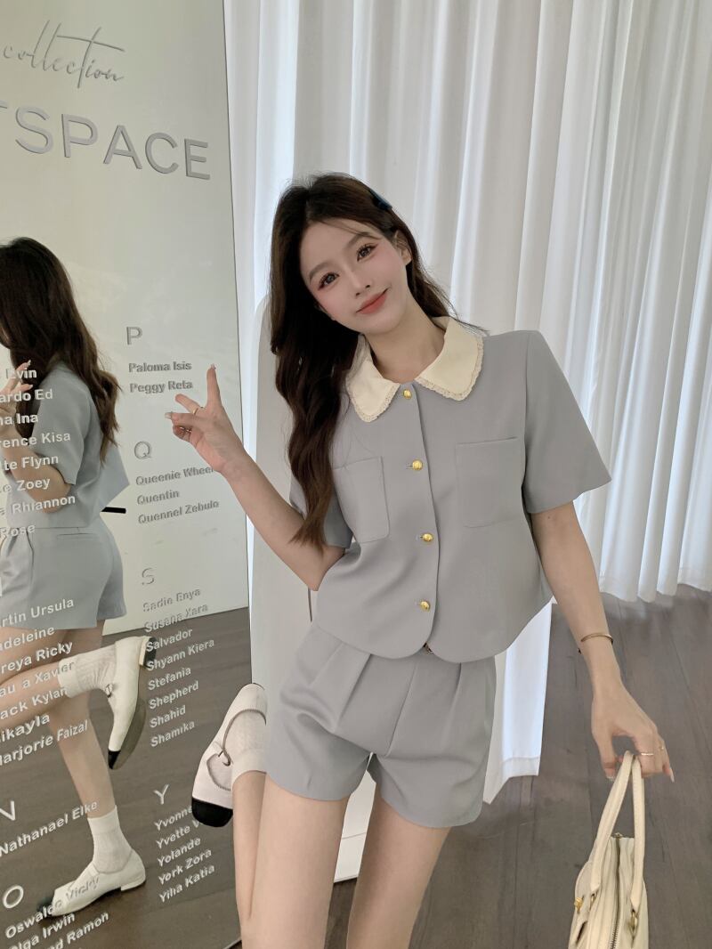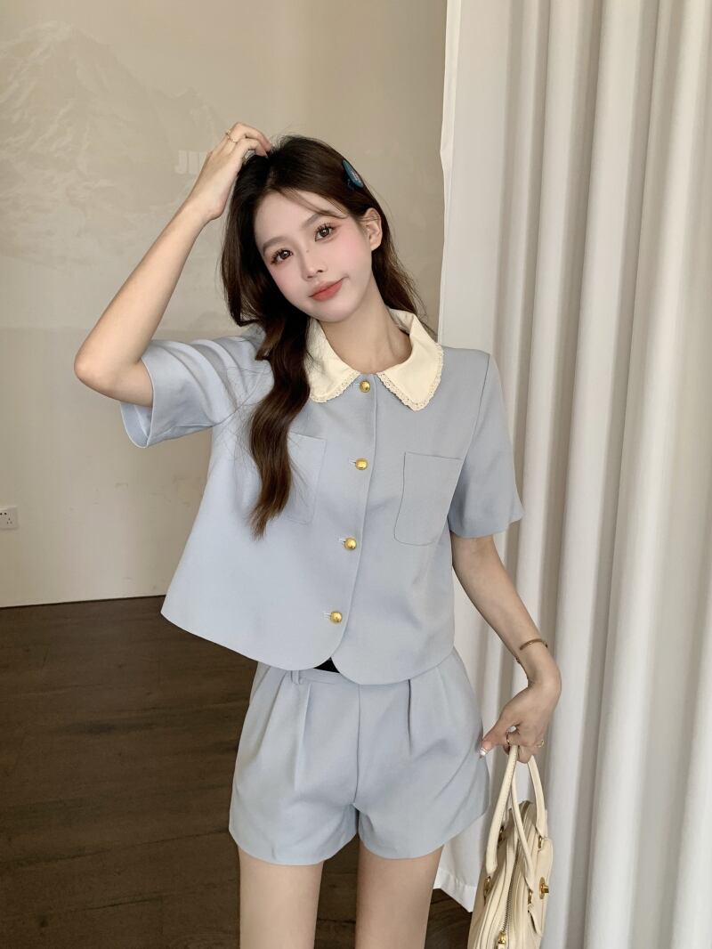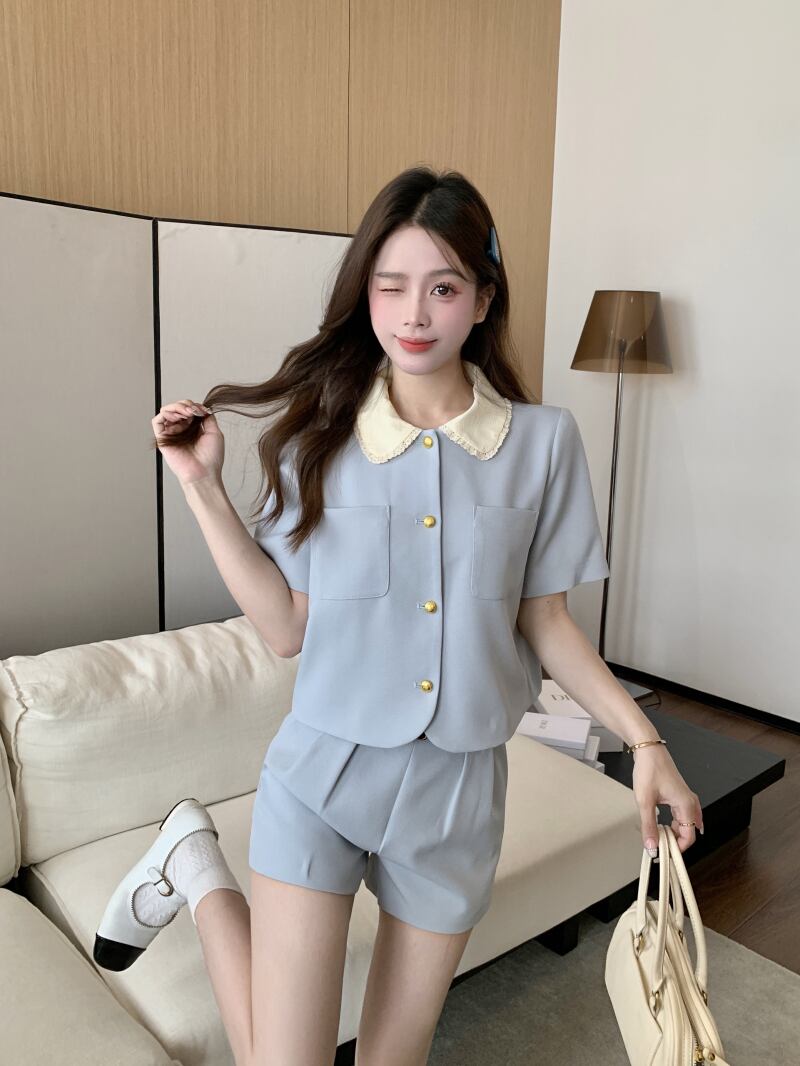 Sweet Hot Girl スーツ レディース 夏 半袖 ターンダウンカラー シャツ ショーツ 2点セット 服 大人ガーリー スウィート キュート カジュアル サマー 夏物 ブルマー