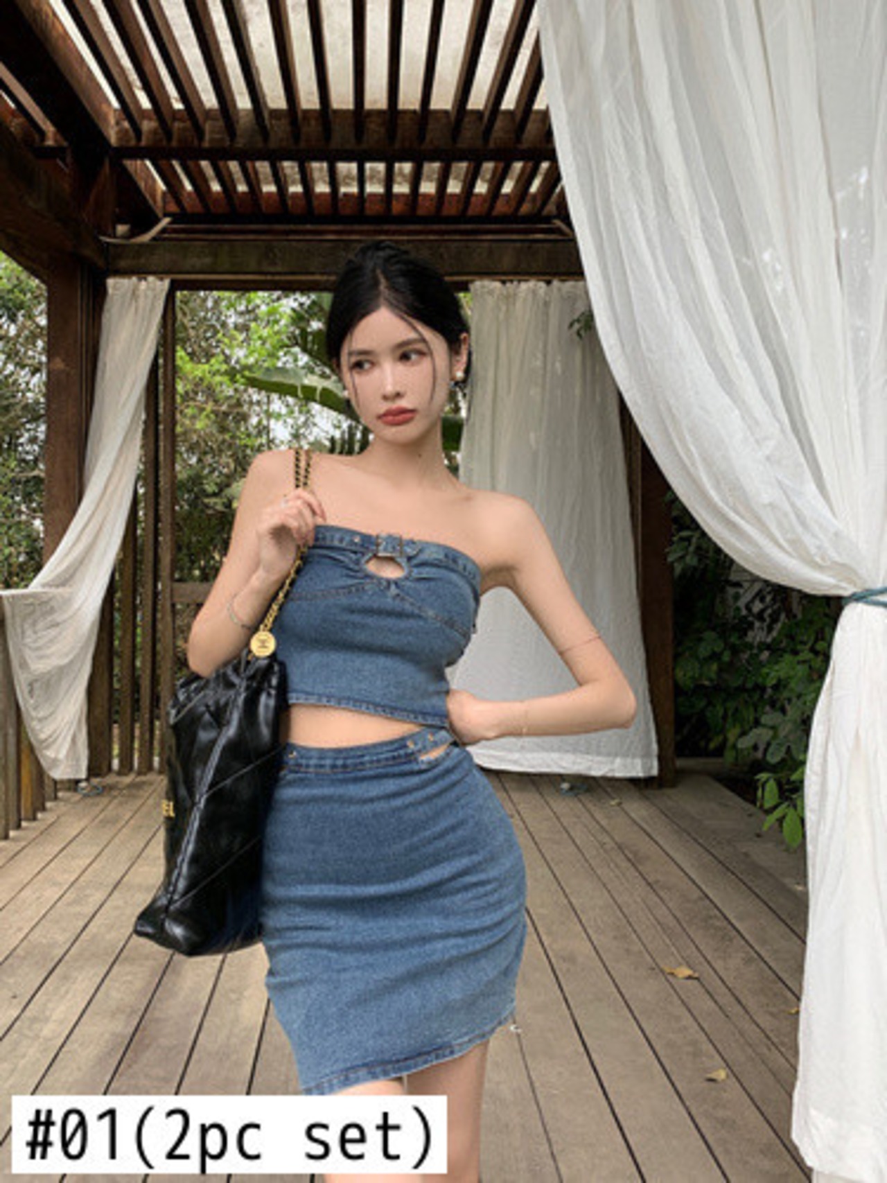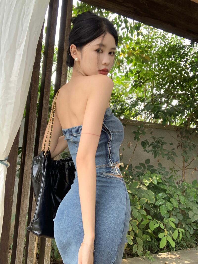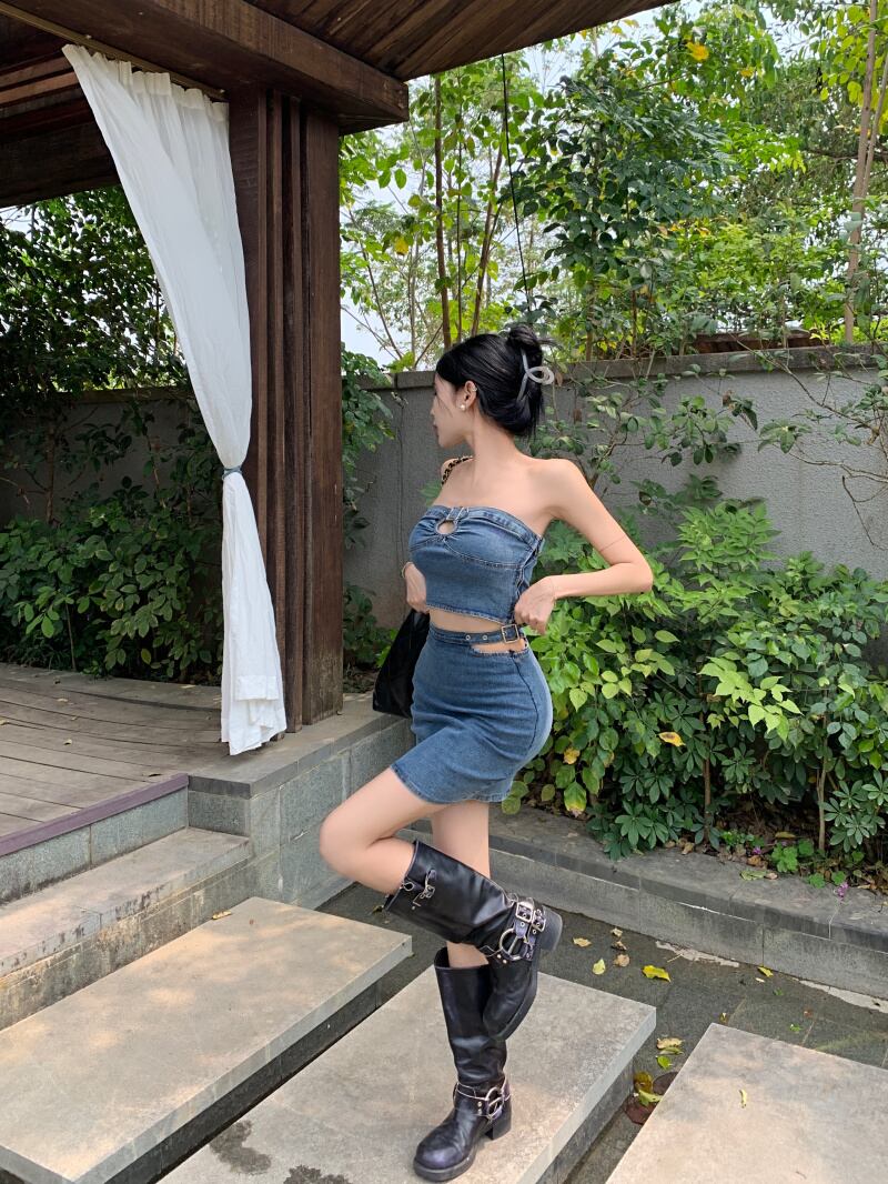 ホットガールデニムスーツウエストくり抜きヒップラップミニスカート夏ストラップレスタンクトップツーピースセット服 サマー 夏物