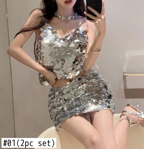 ホットガールスパンコールセクシースーツ夏光沢あるルーズストラップタンクトップウエストミニスカートツーピースセット服 サマー 夏物