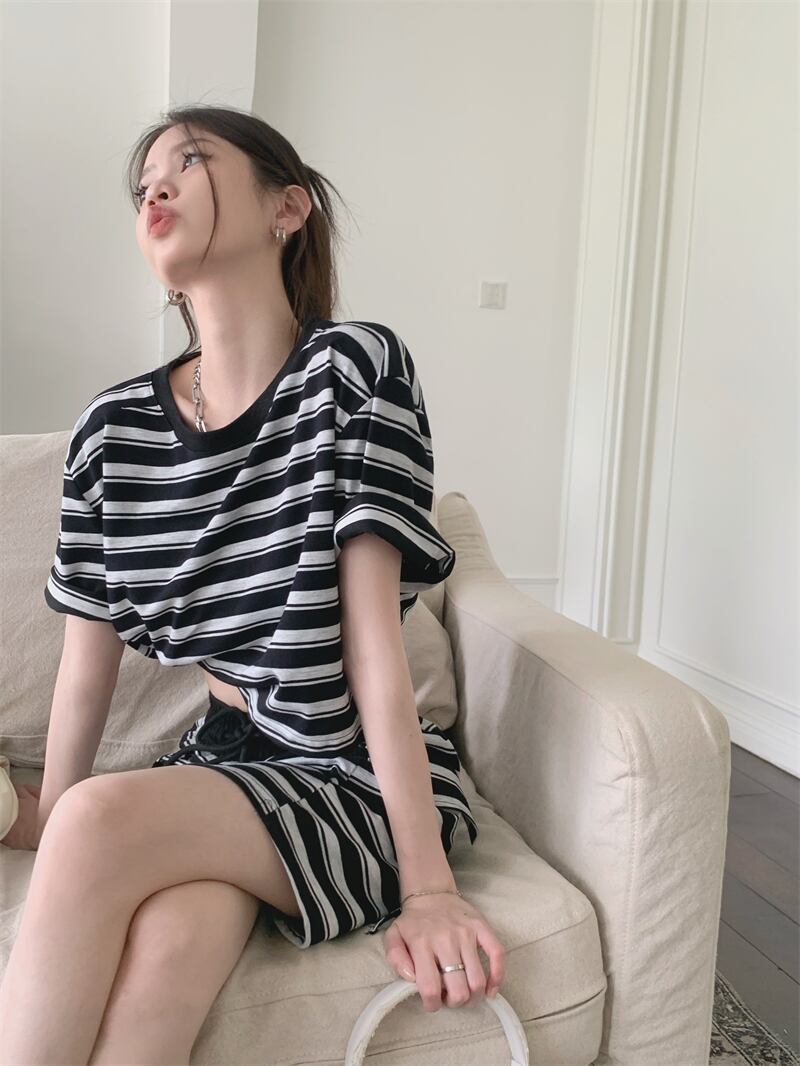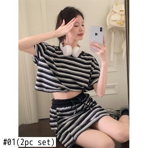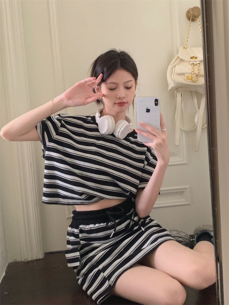 ホットガールスーツ夏背中開いたコントラスト半袖 Tシャツストライプ巾着ミニスカート 2 点セット服 サマー 夏物