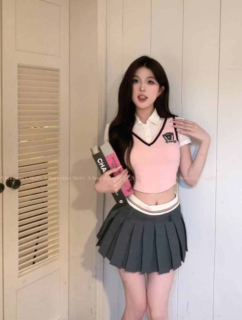 スタイルスーツ夏ポロネックシャツスリムフィットショートニットトッププリーツスカートツーピースセット服 サマー 夏物