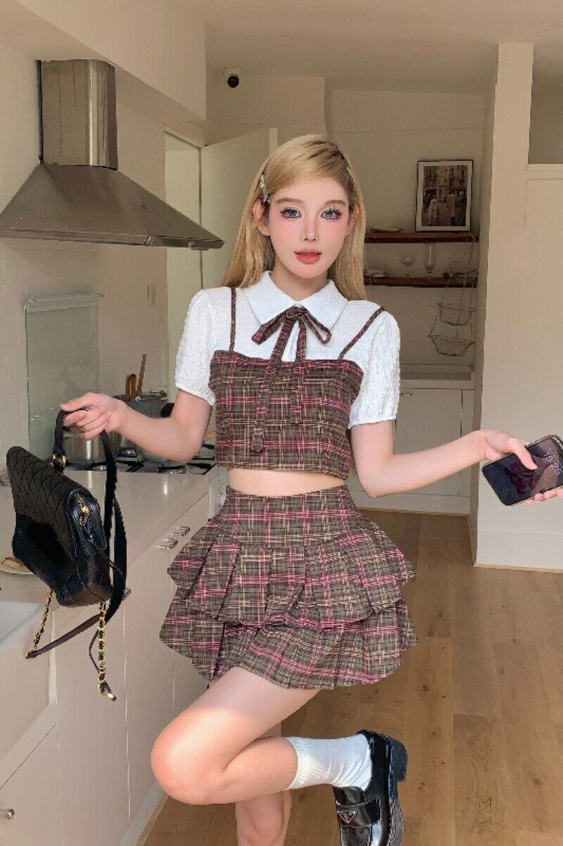 スイートガールスーツ夏チェック柄パネルバブルスリーブシャツトップウエストショートスカートツーピースセット服 大人ガーリー スウィート キュート カジュアル サマー 夏物