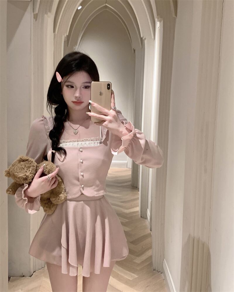 スイートガールズスーツ レディース 夏 スクエアカラー カーディガン サスペンデッド タンクトップ ウエスト Aライン スカート 3点セット 大人ガーリー スウィート キュート カジュアル サマー 夏物 スクウェア