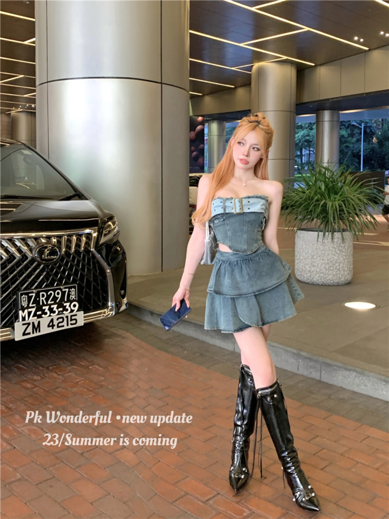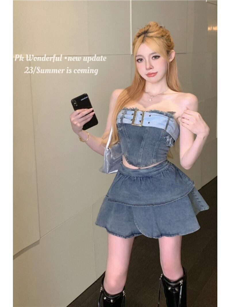 甘いホットガールスタイルデニムスーツ夏ストラップレストップウエスト A ラインショートスカート 2 点セット服 大人ガーリー スウィート キュート カジュアル サマー 夏物 Aライン