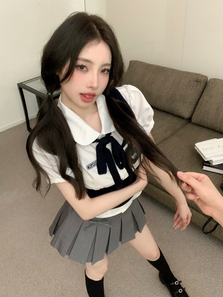 ホットガールスタイルスーツ夏白半袖シャツベストプリーツミニスカート 3 点セット服 ホワイト サマー 夏物