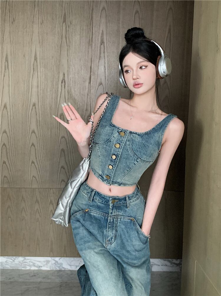 ホットガール純粋セクシーデニムスーツ夏ショートキャミソールウエストワイドレッグパンツ 2 点セット服 サマー 夏物 ワイドパンツ ピュア
