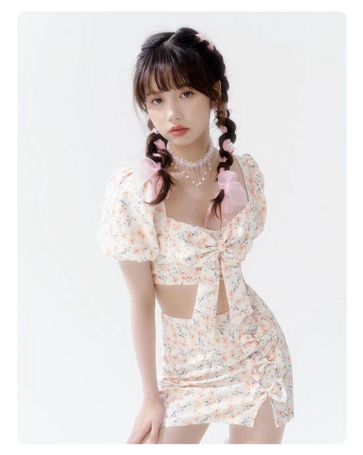 スタイル甘くてホットガールズスーツ夏花柄リボン半袖トップウエストスプリットミニスカート 2 点セット 大人ガーリー スウィート キュート カジュアル サマー 夏物