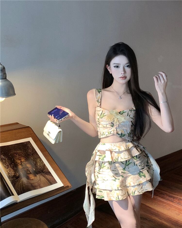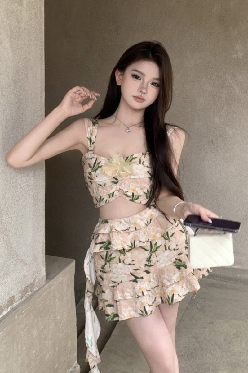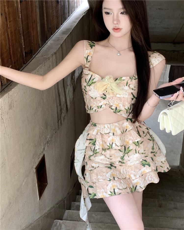 フレンチスタイルホットガールスーツ夏 3D フラワーストラップトップウエスト A ラインミニスカート 2 点セット服 サマー 夏物 Aライン フラワーデザイン