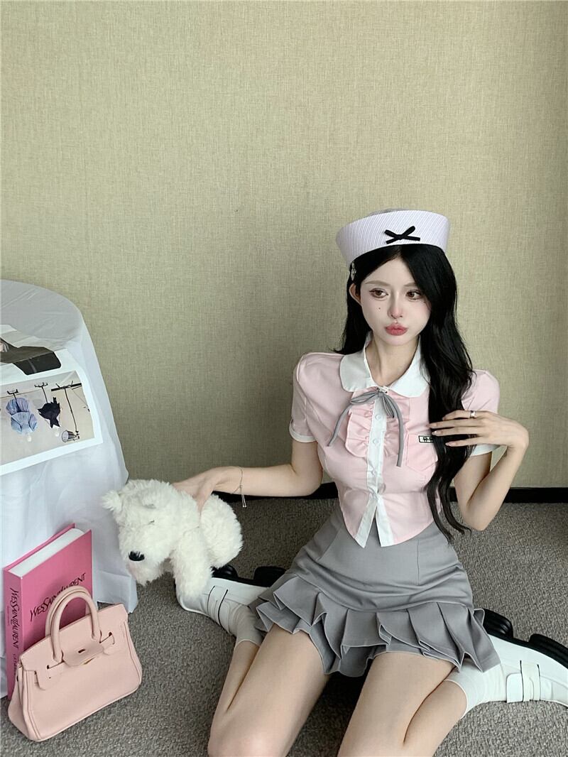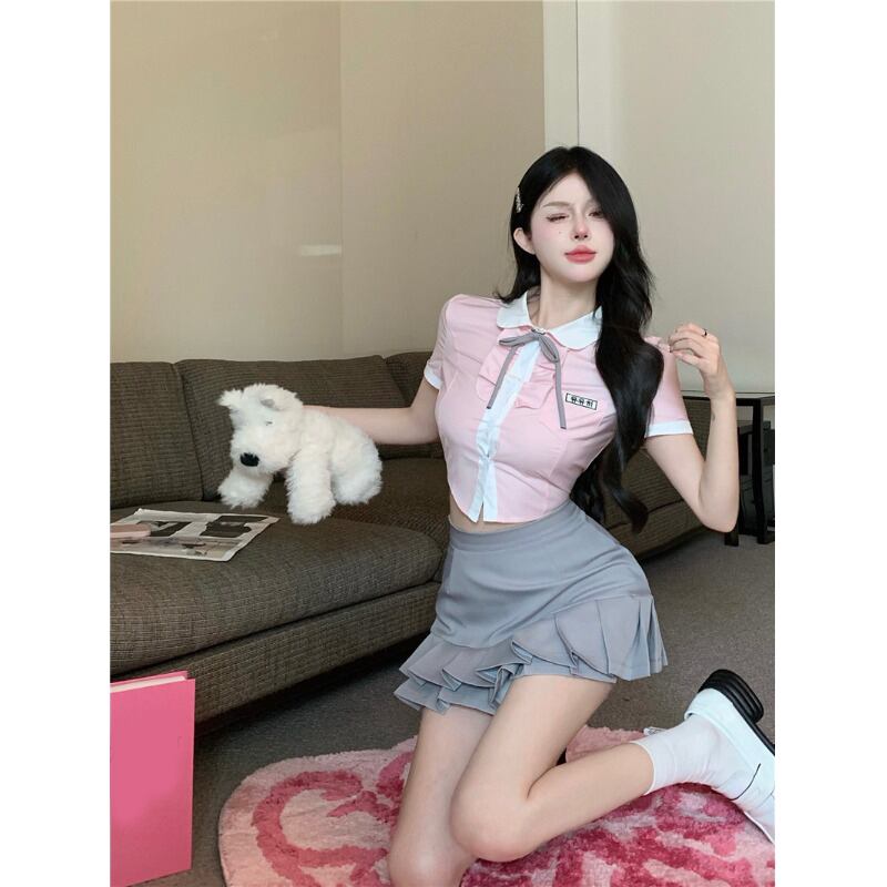 プレッピースタイル甘くてホットガールスーツ夏ショートシャツトップウエストミニスカートツーピースセット服 大人ガーリー スウィート キュート カジュアル サマー 夏物
