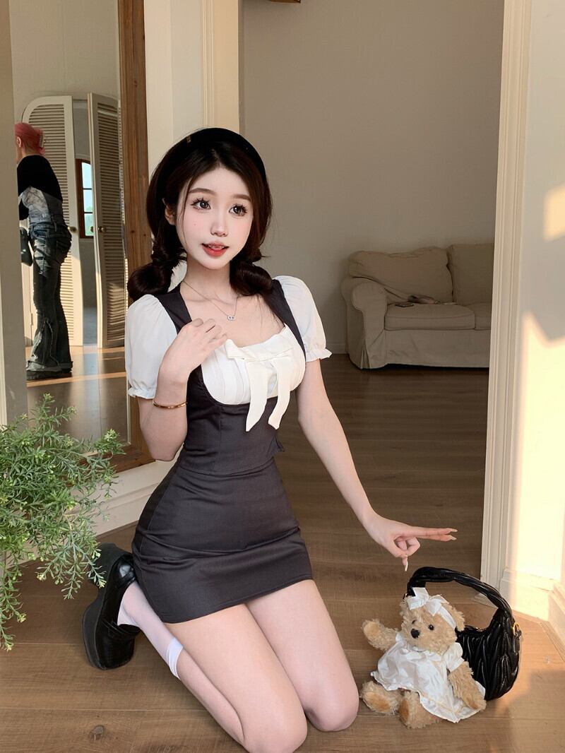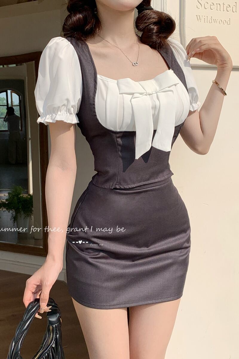 純粋セクシー甘いホットガールスーツ夏スクエアカラースリムトップヒップラップミニスカートツーピースセット服 大人ガーリー スウィート キュート カジュアル サマー 夏物 スクウェア