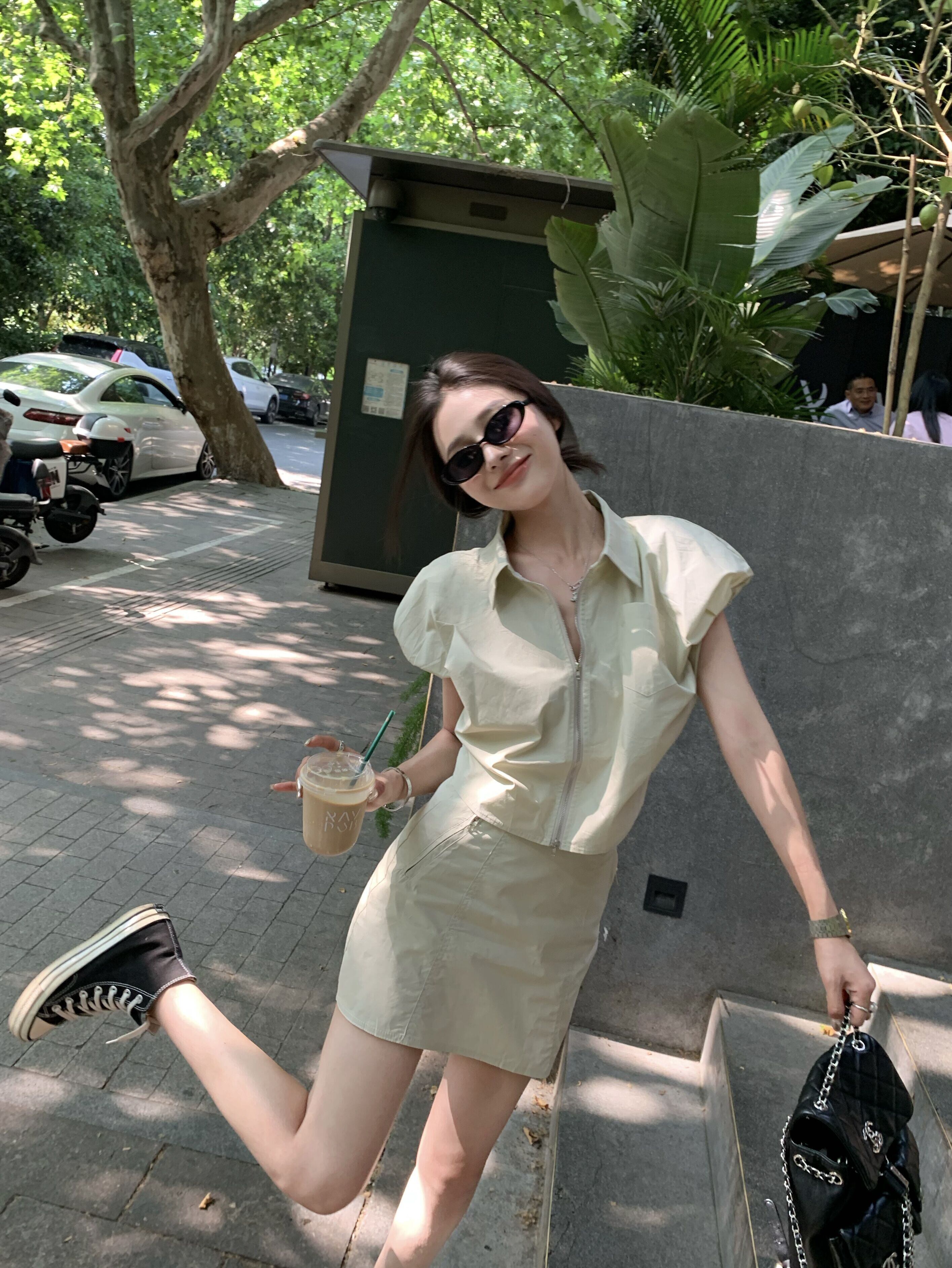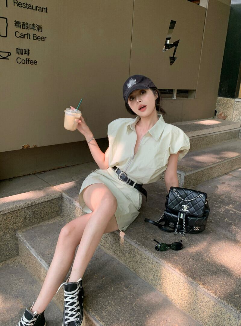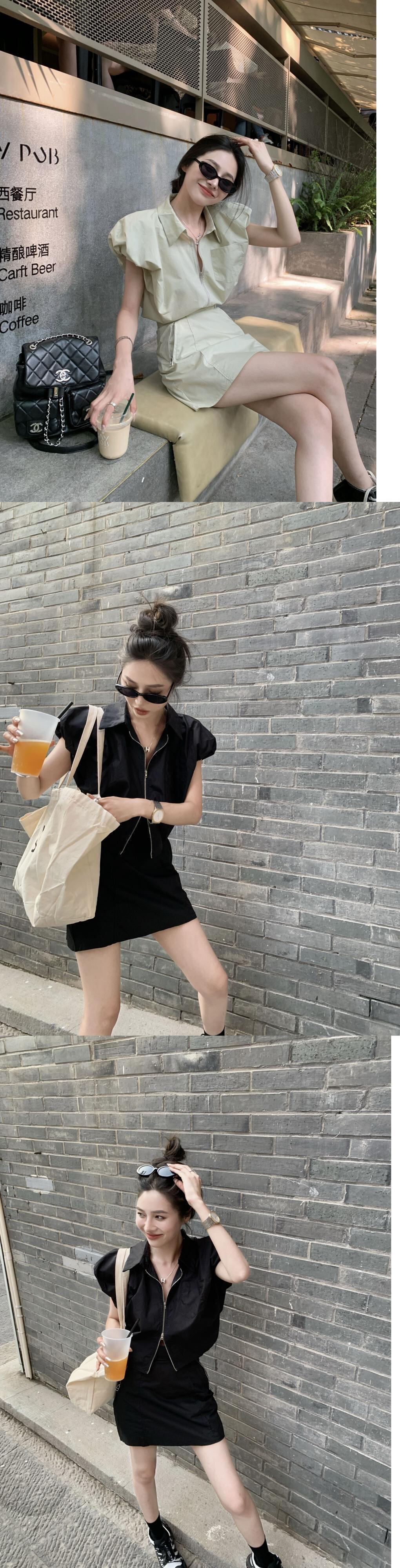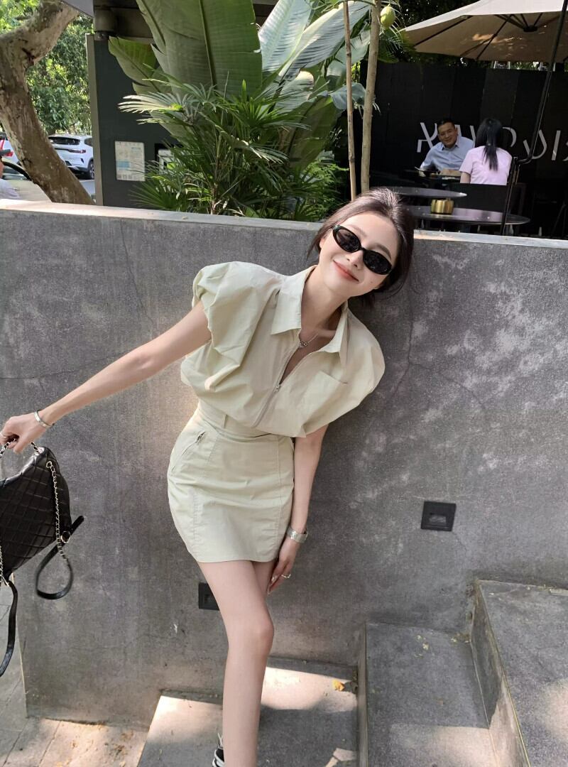 ホットガールスーツ夏ポロネック半袖シャツウエストラップヒップショートスカートツーピースセット服 サマー 夏物 Oネック