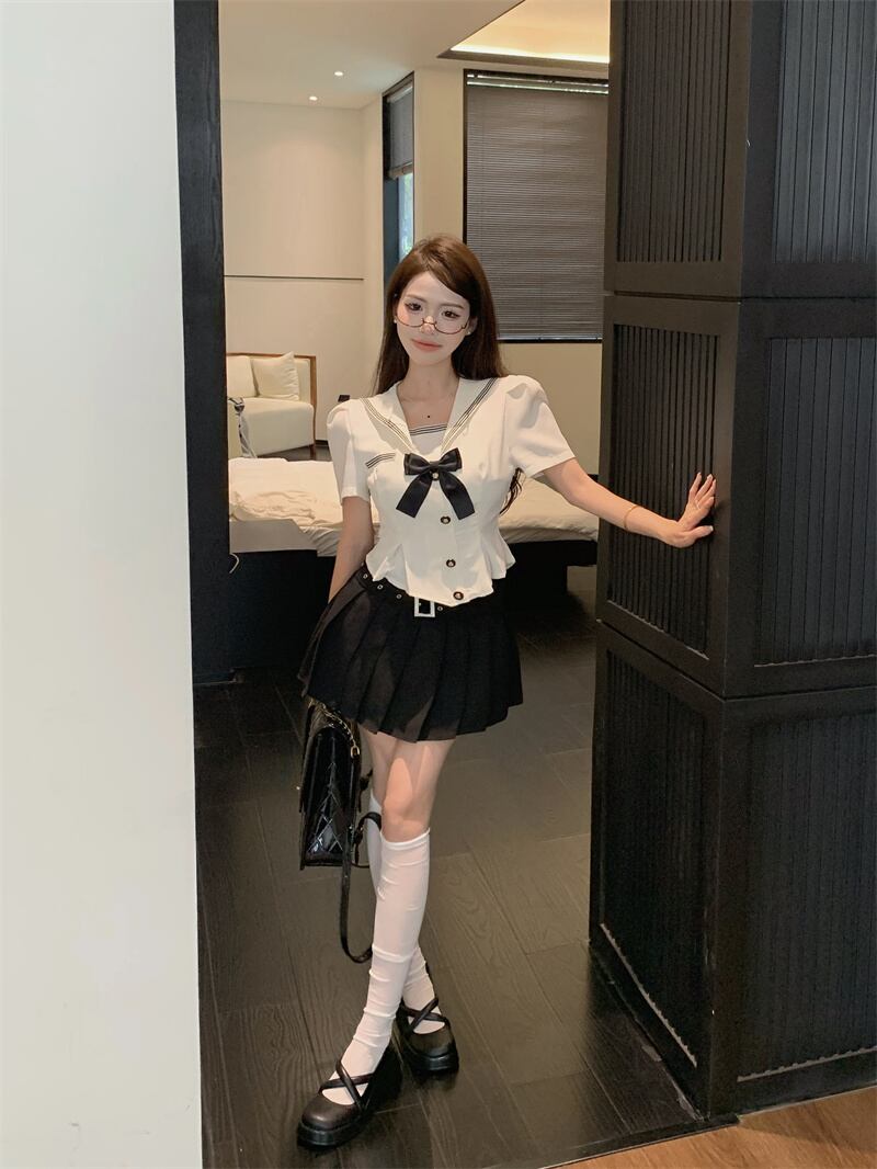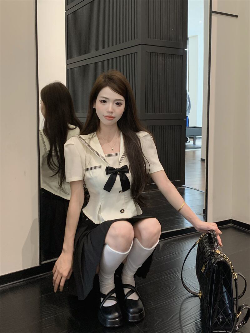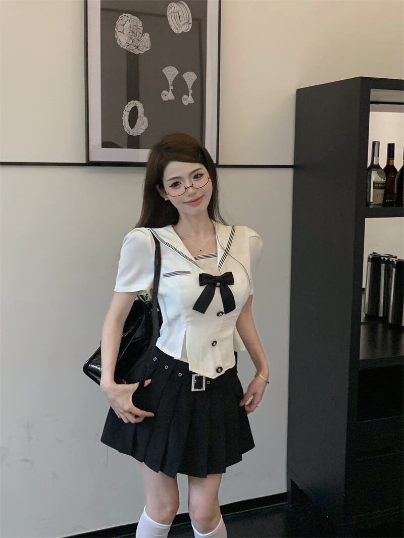 スイートホットガールズスタイルスーツ夏セーラー襟半袖ボウトップウエスト A ラインミニスカート 2 点セット リボン 大人ガーリー スウィート キュート カジュアル サマー 夏物 Aライン